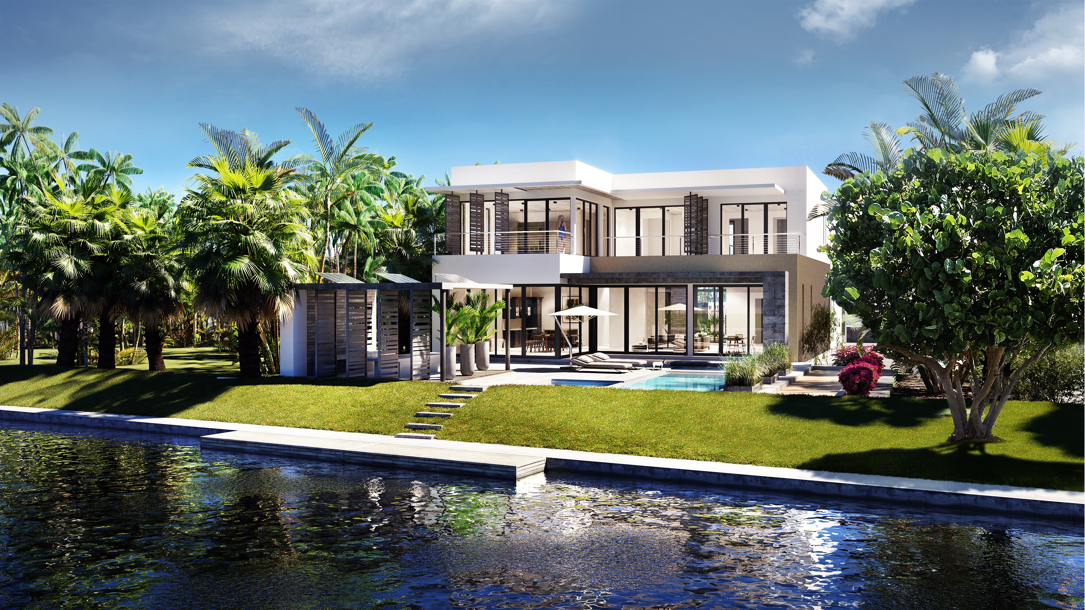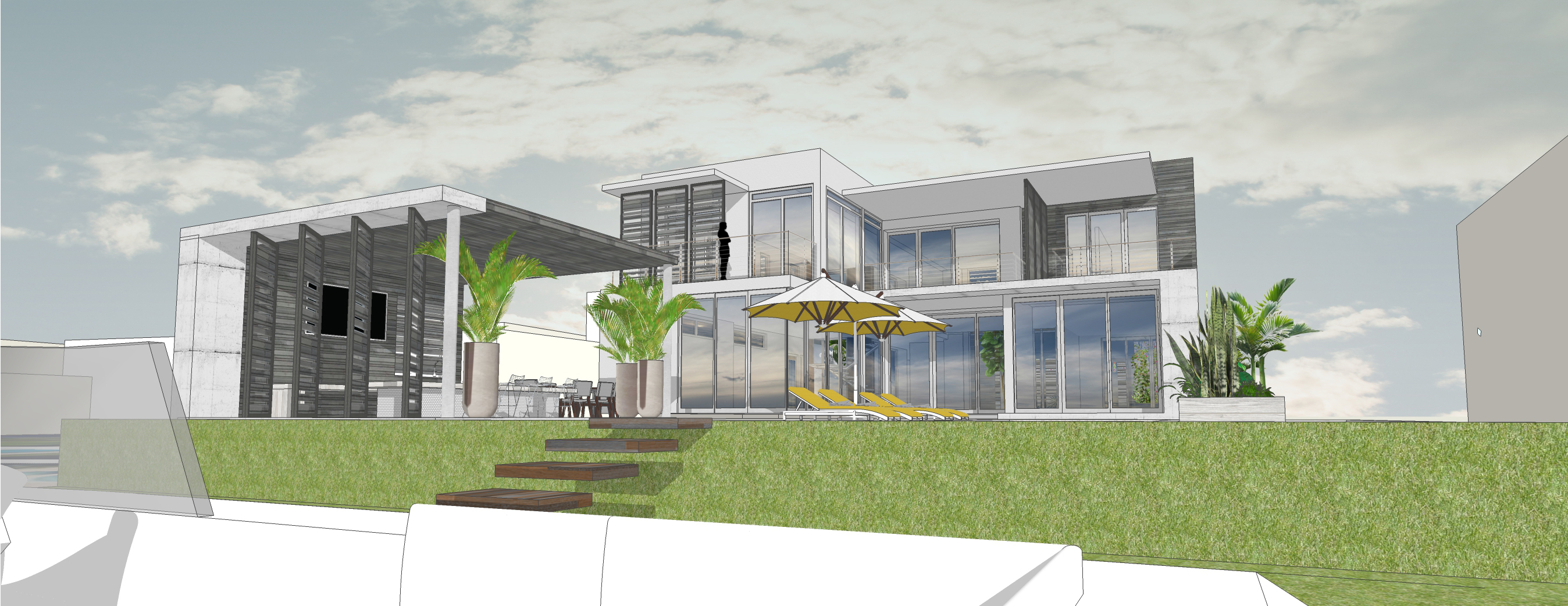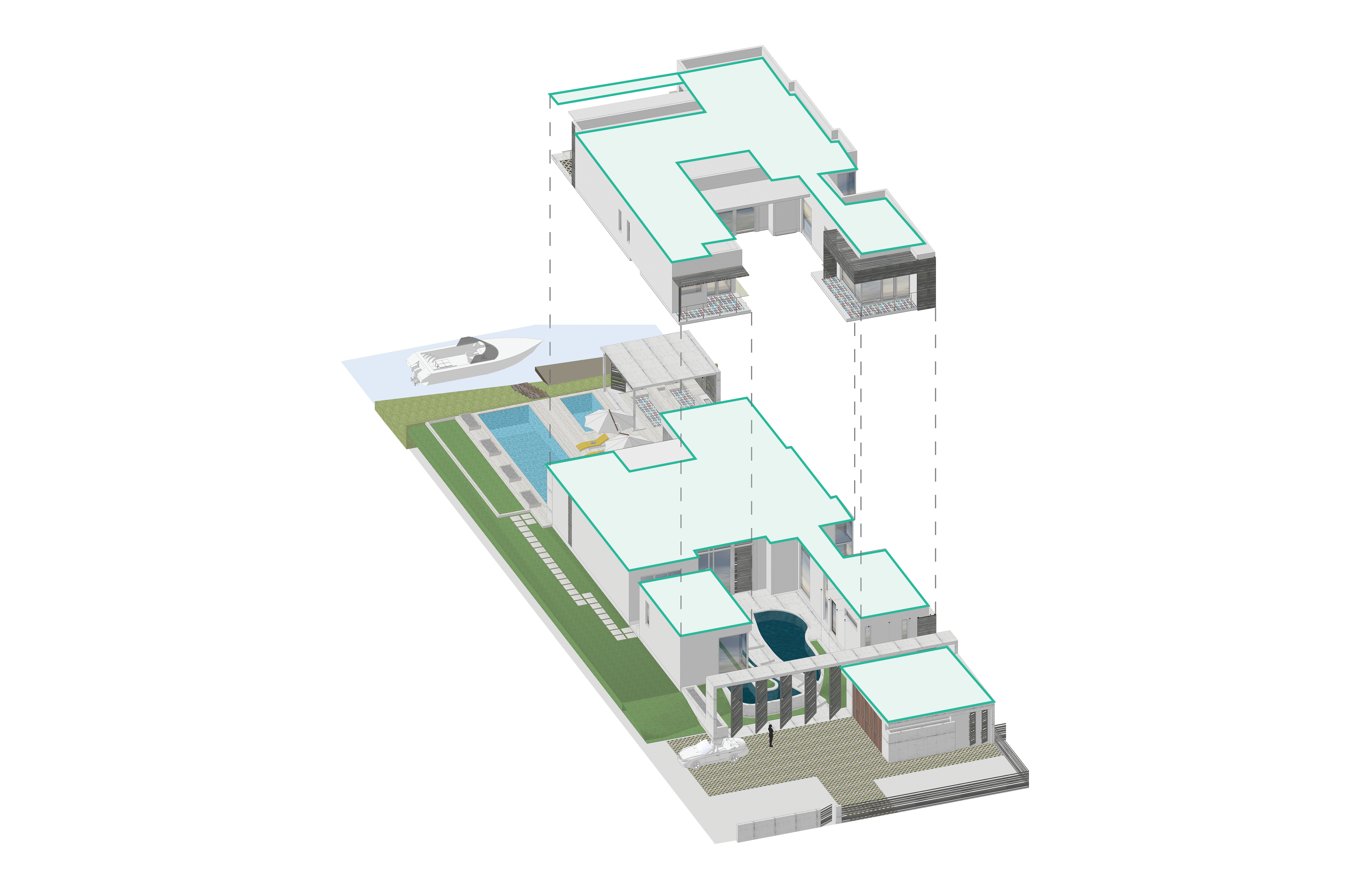 yard with canal access. The house’s main access proposes an operable layer of large louvers which open and close. The following layer is a composition of water and vegetation features which leads to the entrance via a meandering walkway. In the rear yard, secondary sets of smaller, operable louvers control the access of natural light and add a layer of operability that is rare in the local architecture.