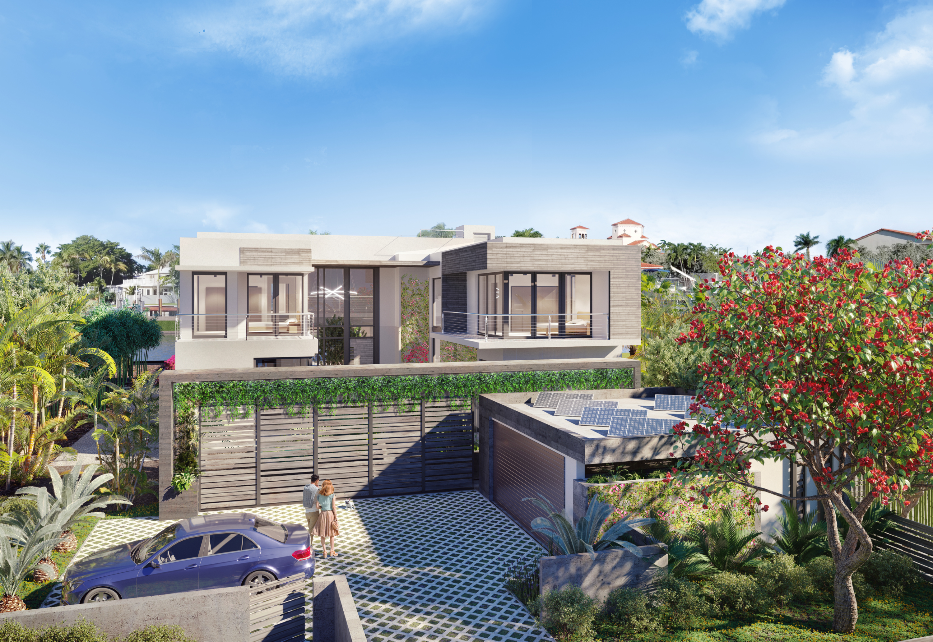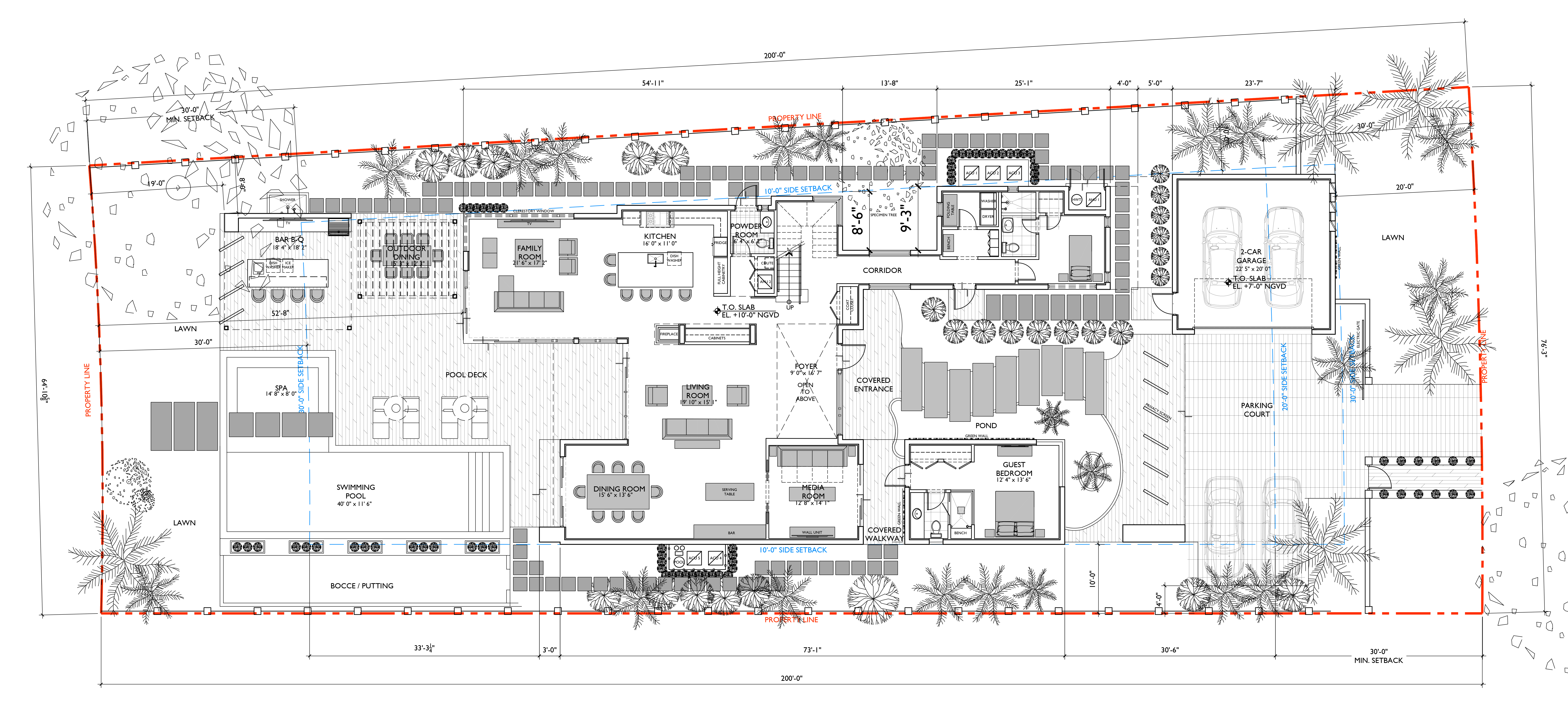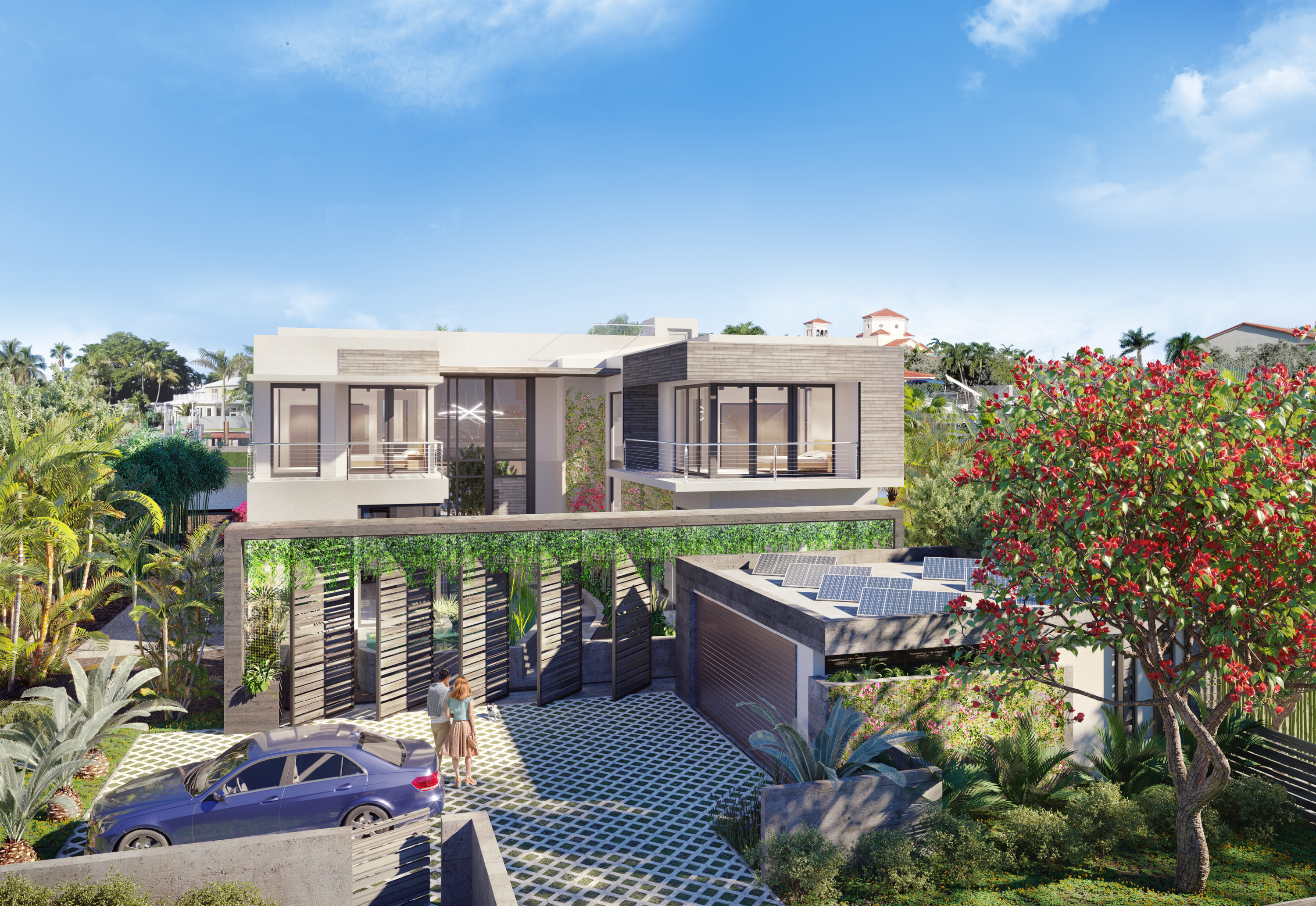 yard with canal access. The house’s main access proposes an operable layer of large louvers which open and close. The following layer is a composition of water and vegetation features which leads to the entrance via a meandering walkway. In the rear yard, secondary sets of smaller, operable louvers control the access of natural light and add a layer of operability that is rare in the local architecture.