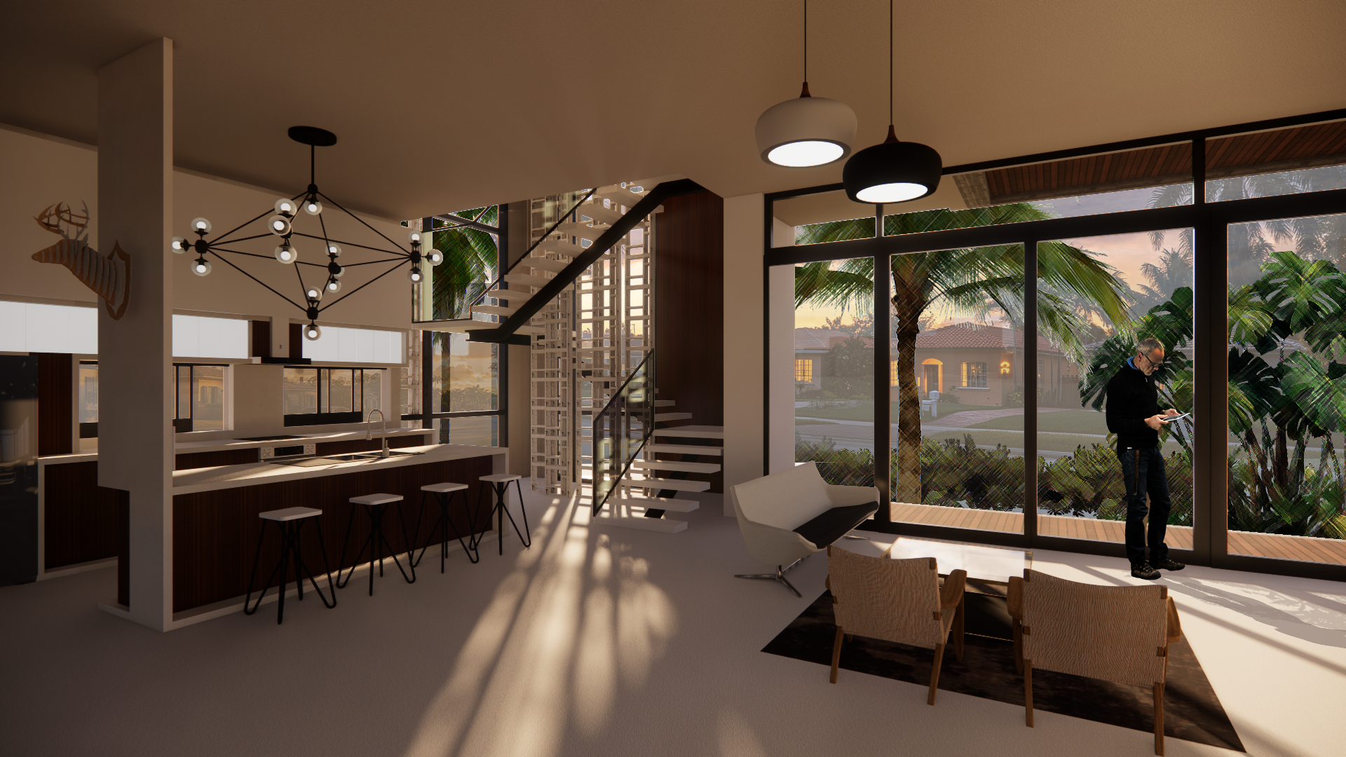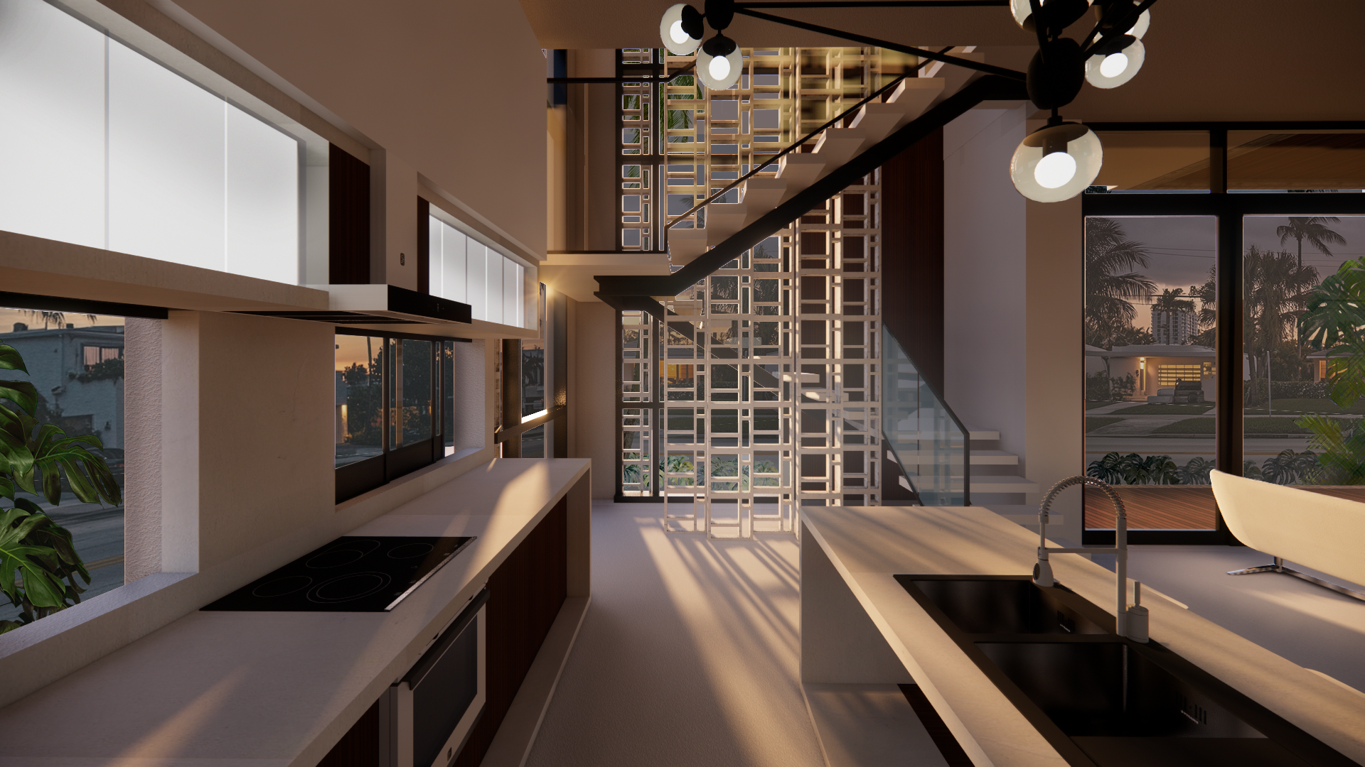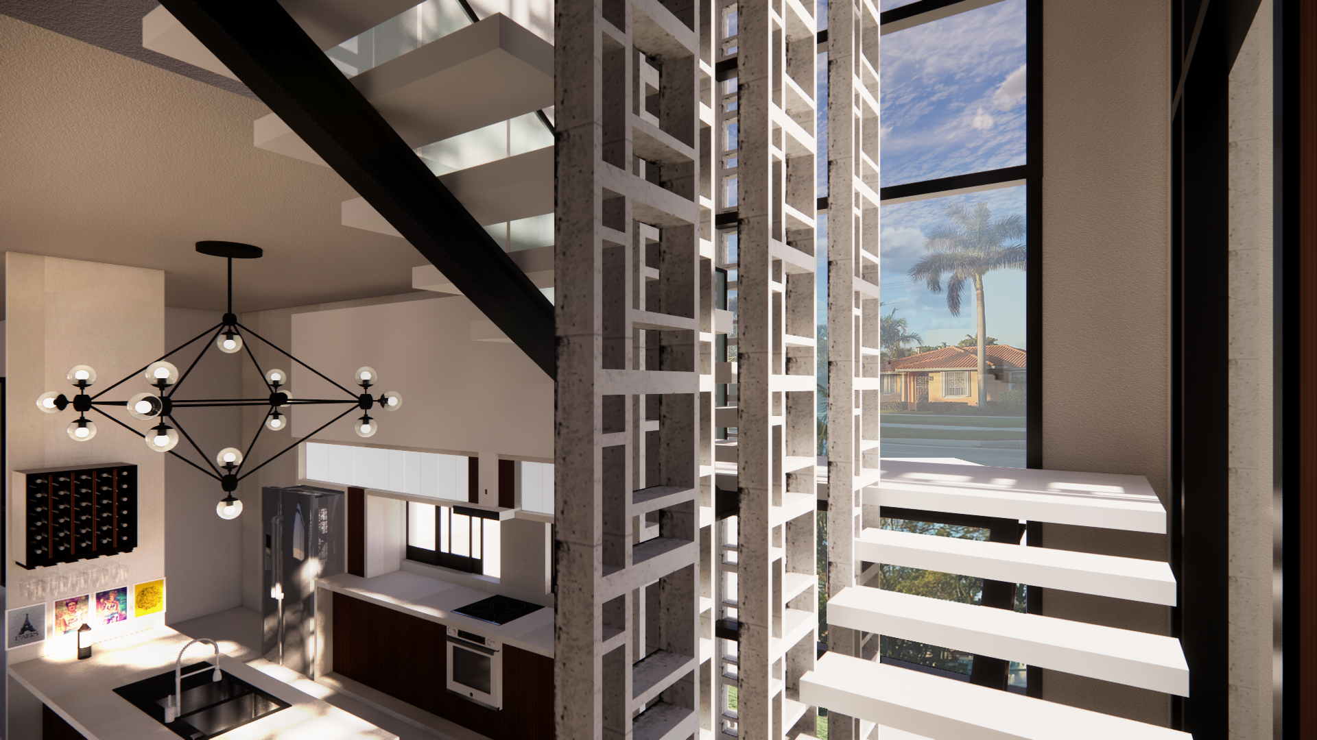 A valuable, common factor in houses built in the earlier half of the XX century is that the way that they controlled incoming light organically became an architectural facade feature. I seek to give this house a timeless feature by carving light that enters the main living room, as sunrise and morning light slices through an vertical ensemble of breezeblocks that form the core of the floating stairway.