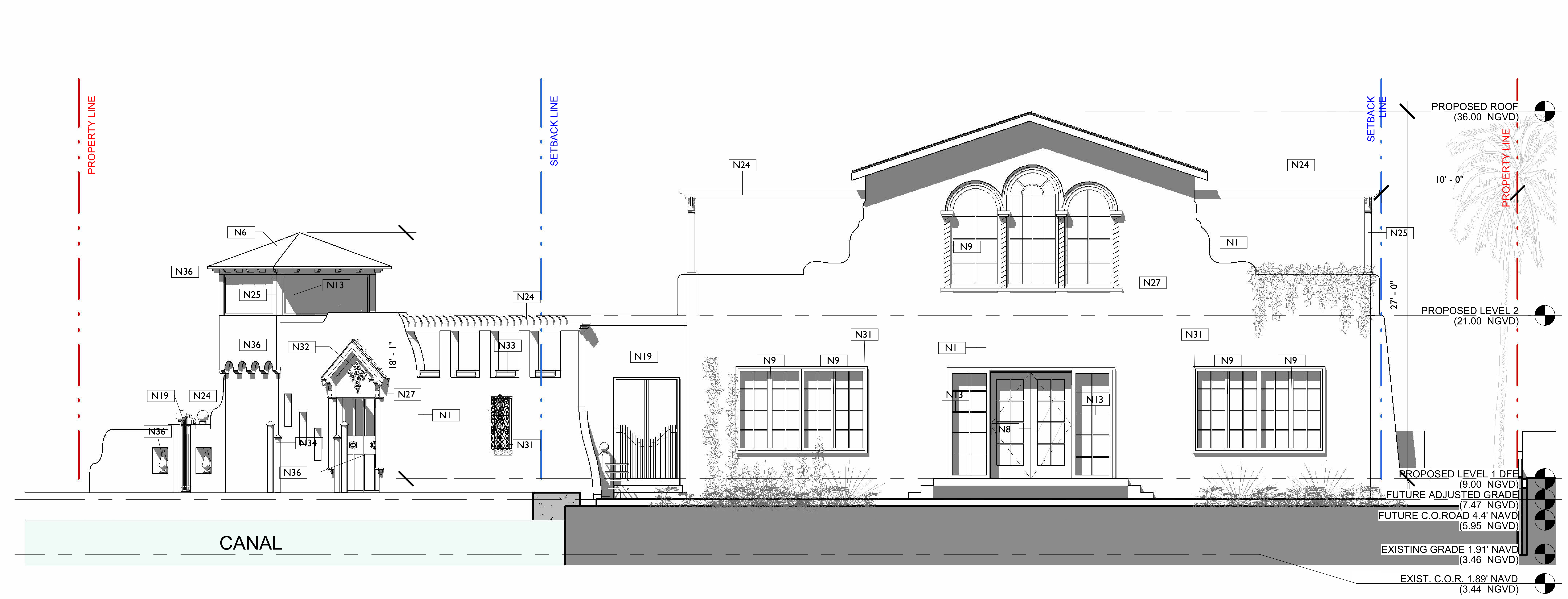 inspired profiles, reveals and scrolls. A comparison of the drawings of the proposed home and available imagery of the existing structures demonstrate the care under which the facades and courtyard spaces have been designed.