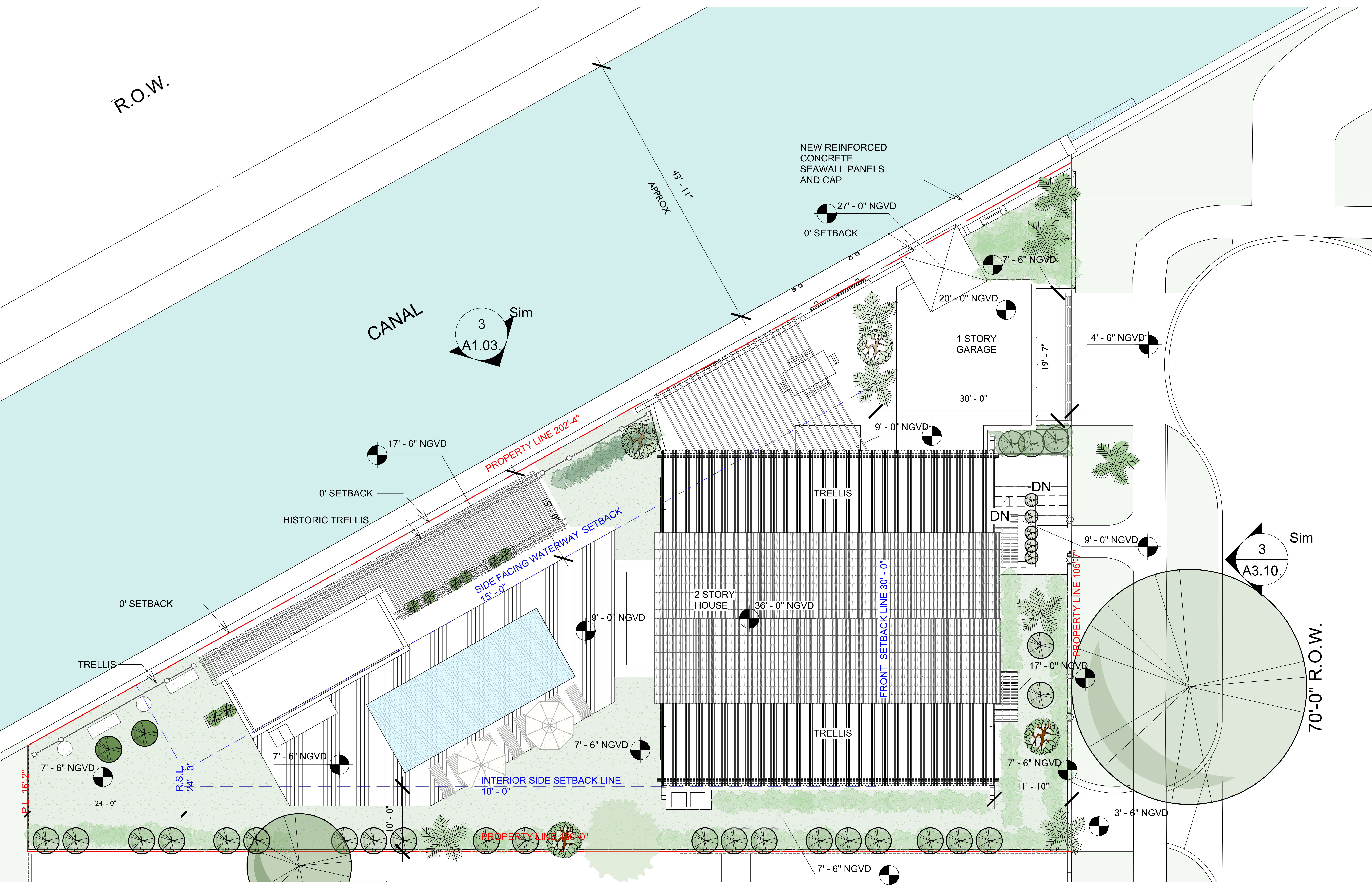 The proposed reconstruction respects the design intent of the neighboring structures, while being significantly raised in elevation. The proposed house is not bound by setbacks imposed by current development regulations. This variance is necessary to reconstruct the property in the highest possible fidelity.