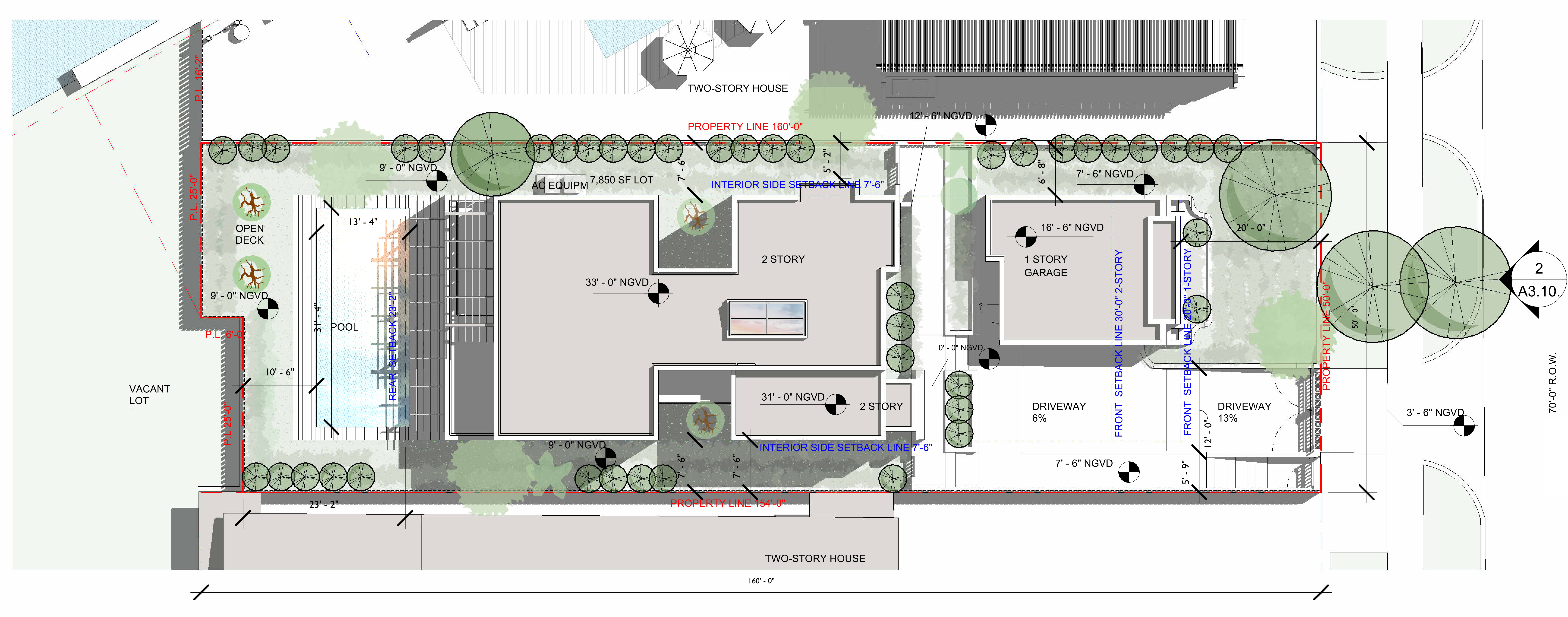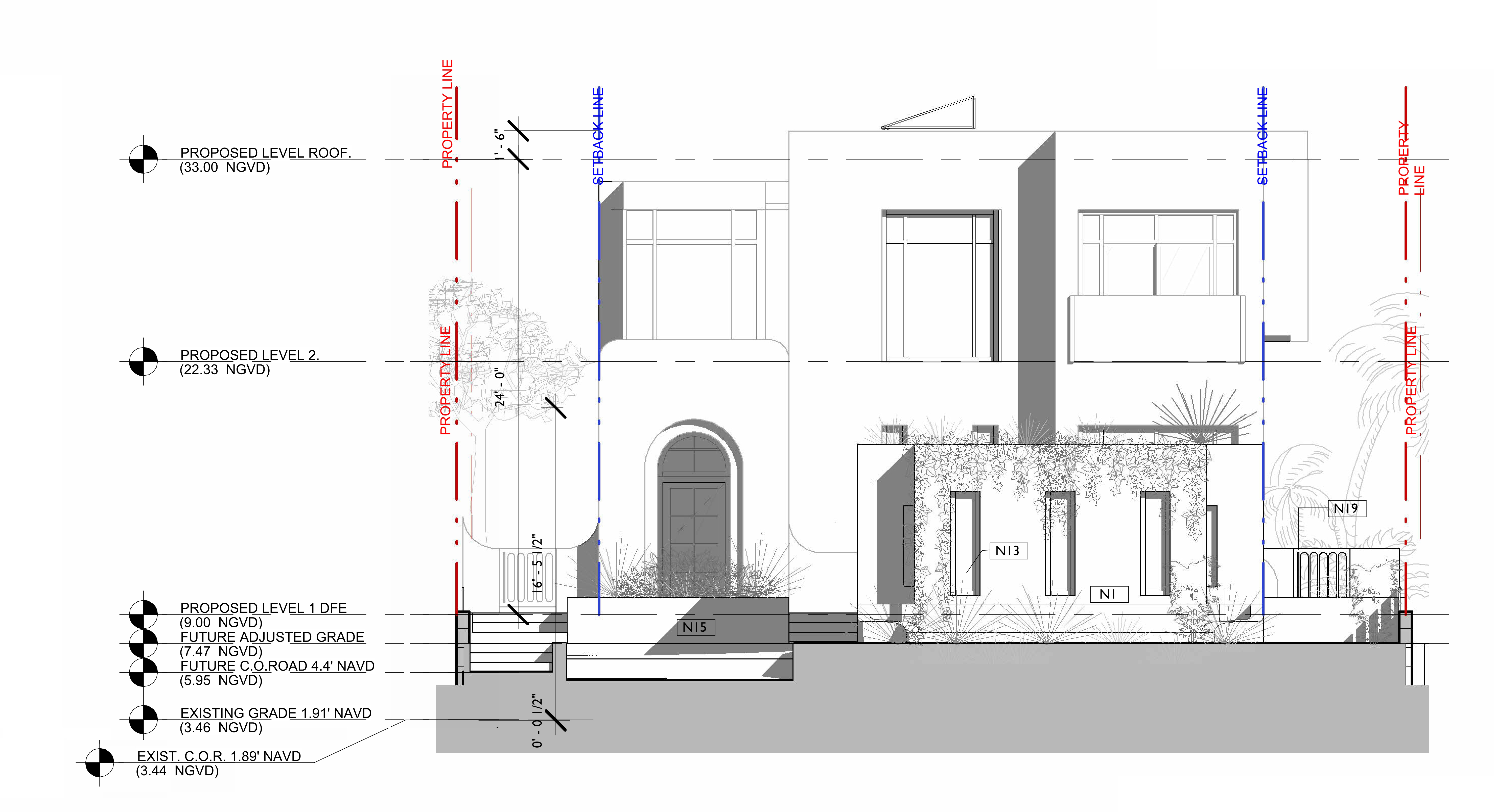 The proposed reconstruction is bound by setbacks imposed by current development regulations, and respects the design intent of the neighboring structures, while being significantly raised in elevation for passive ocean-level rise protection. To recall and accentuate the original entrance, the awning is pulled forward and creates a shaded porch. The aperture into the porch is an arched opening, recalling the curved corners of the original entrance in a more pronounced manner. Originally, a long sprawling yard allowed significant distance between the house and the street. In our reconstruction, the building follows the same setback distance as the original house, leaving significant space between itself and the road.