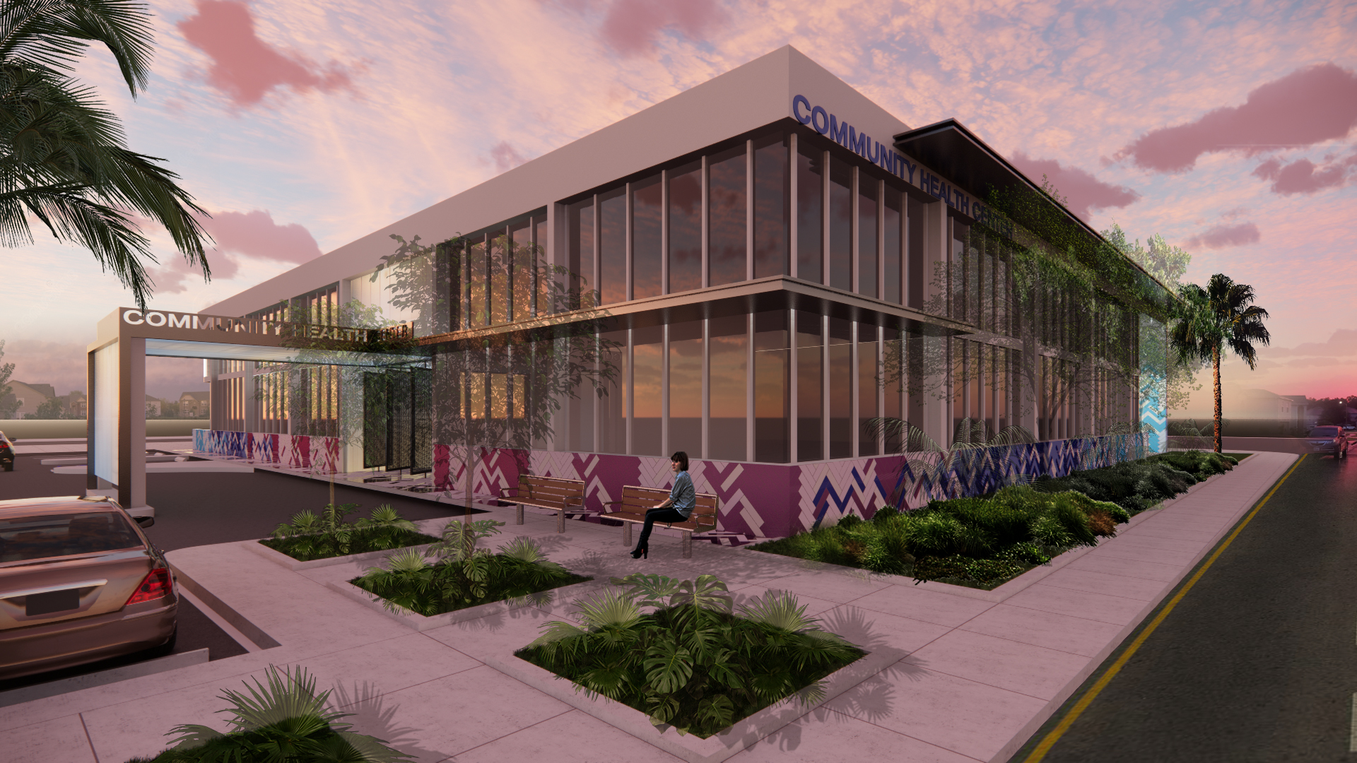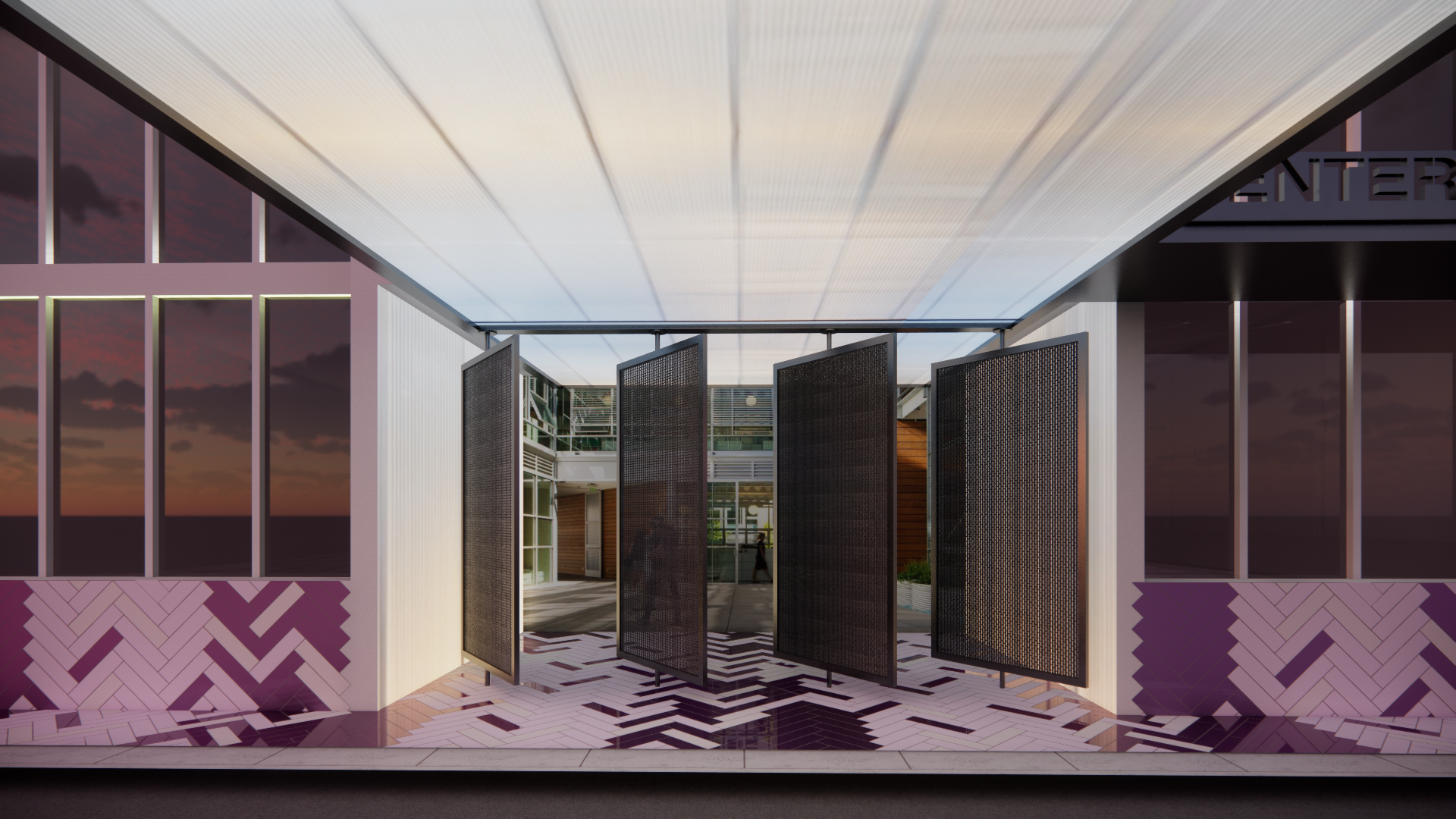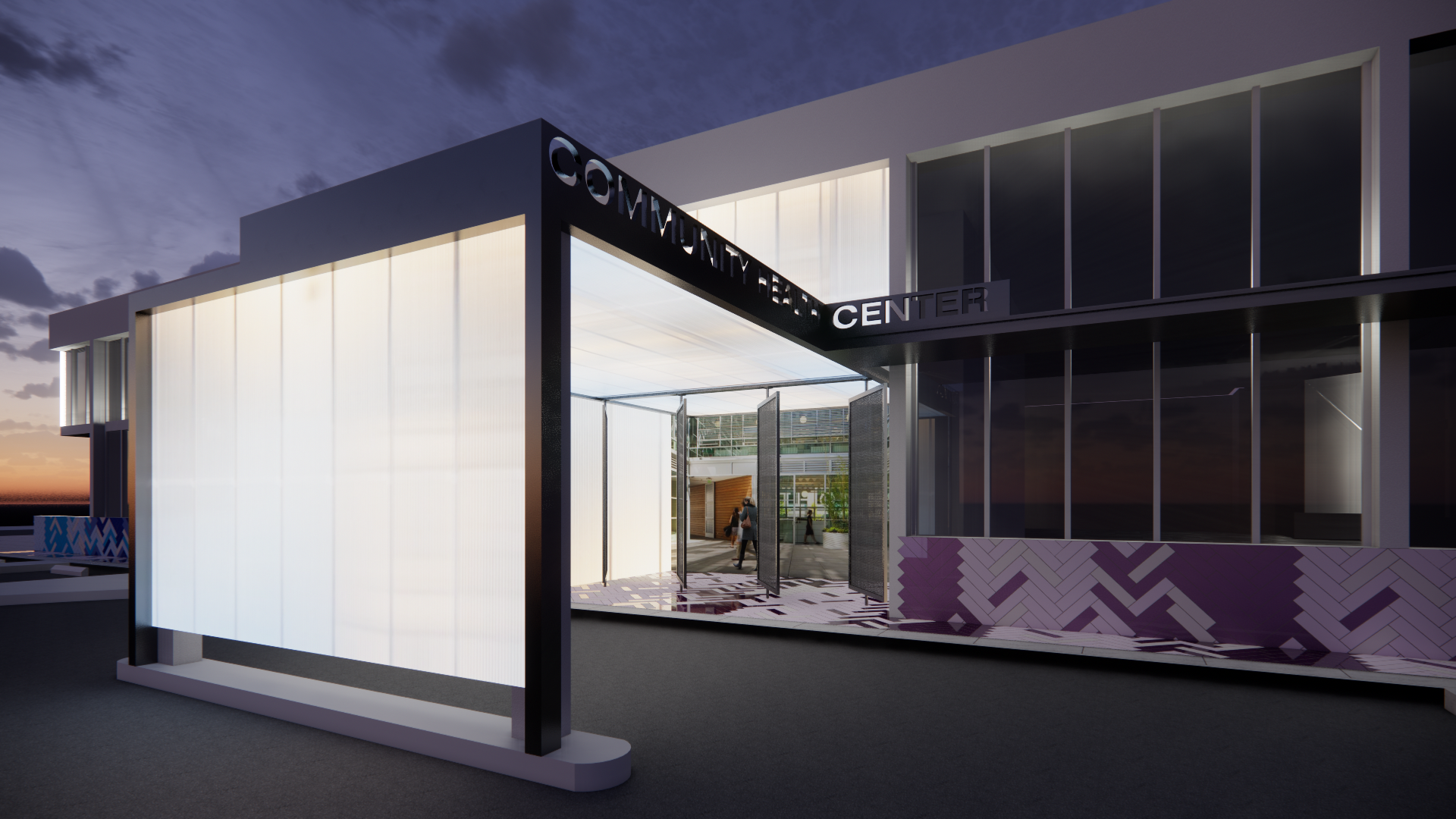 Light distributed along the main entry expresses that this community center welcomes those in need after office hours.
