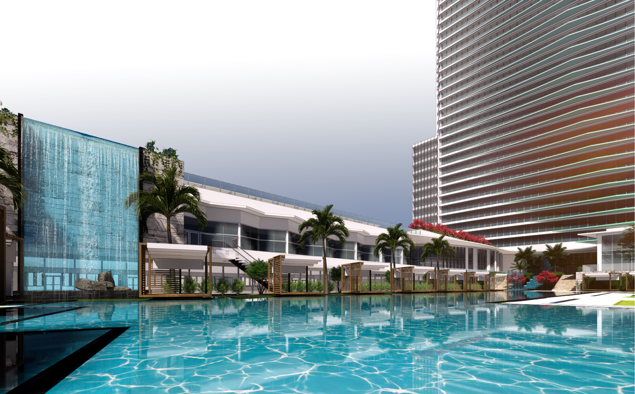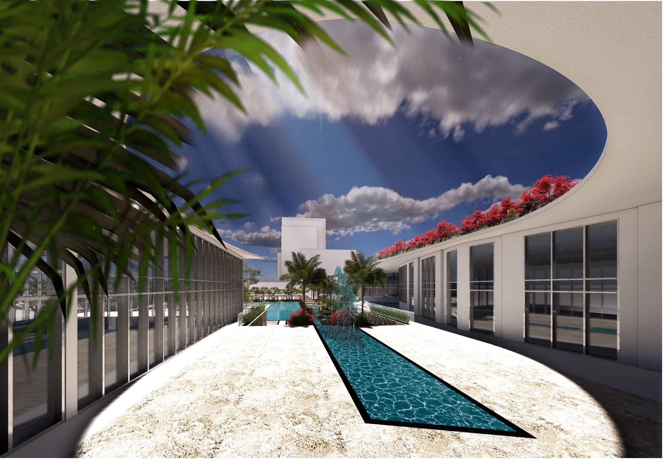 The majestic size of the original pool was honored with a large L-shaped pool bordered by cabanas that rest as islands within the pool’s west edge. A water feature complementing proposed roof guestrooms at the lower south component cascaded down to the pool. In the facade of this component, the original zig zag footprint was respected. A smaller water feature cascades as to follow visitors in their path down the stairs from the main lobby and dining areas and into the pool deck.