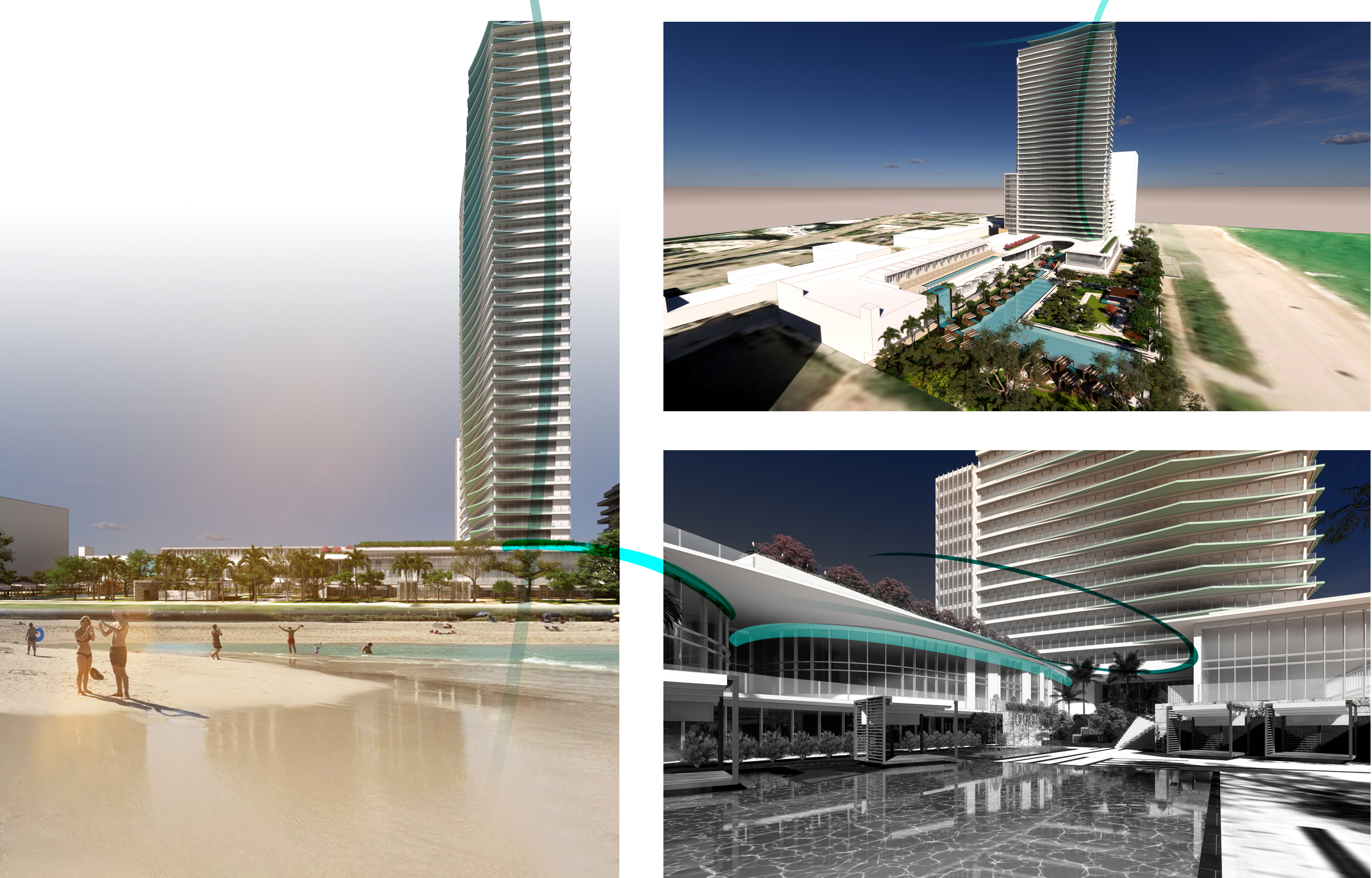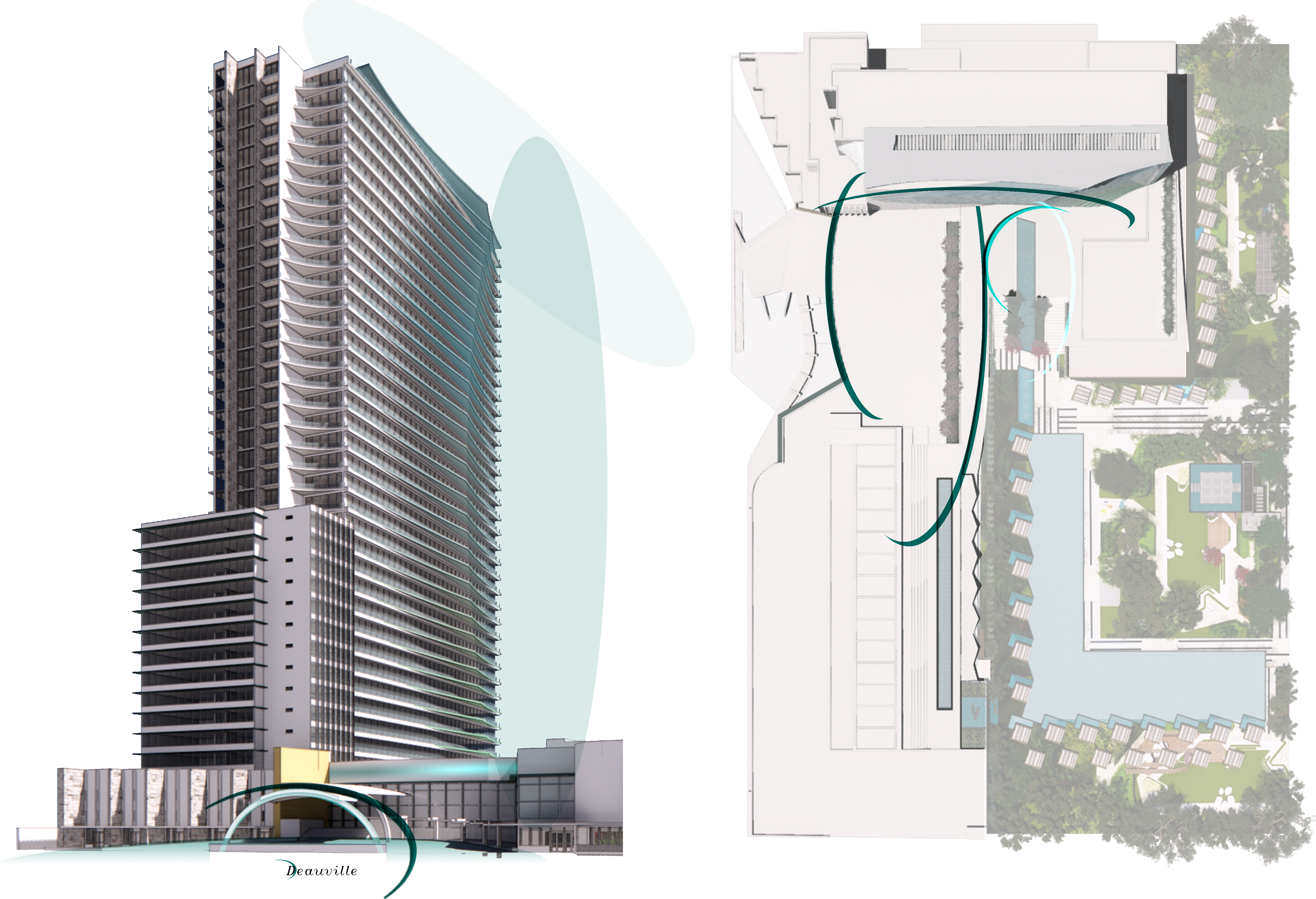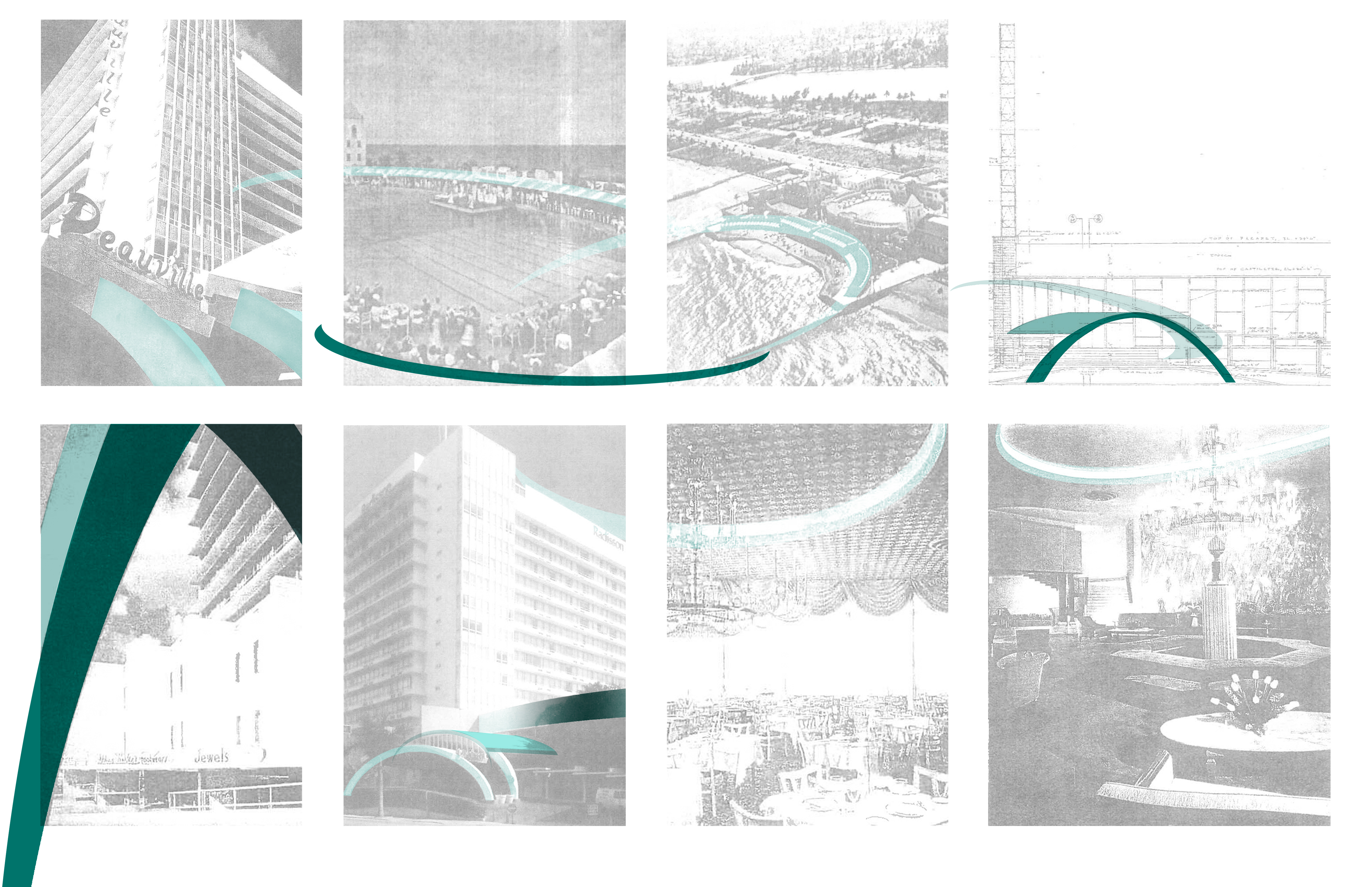 When the original Deauville was built in the 1920’s as the Deauville Casino Hotel, the massive oval 165' x 1 00' saltwater pool stood next to a large pavilion structure where bands would play into the night. The structure enclosed the beach area in front of the property in a bold manner impossible to replicate today. After the Great Depression, the property was sold and renamed as the MacFadden-Deauville. MacFadden was a fitness expert who turned the hotel into a health resort. The Pavilion structure was removed at some point, and the iconic diving board platform designed by Igor Polevitzky was conceived. The most recent building was designed by Melvin Grossman in 1957 in the MIMO style that flourished at the time. Its most iconic design feature was a parabolic arch defining the porte cochere canopy. A zig zag wall delineated the west area of the large pool. Vertical fins expressed the south facade of the main tower, while horizontal bris soleil protected the west facade from the afternoon sun. Coral stone cladded its podium. Upon the decline of the hotel industry in the early 1980's, the hotel turned to condominium ownership. It was later operated as a Radisson Hotel.