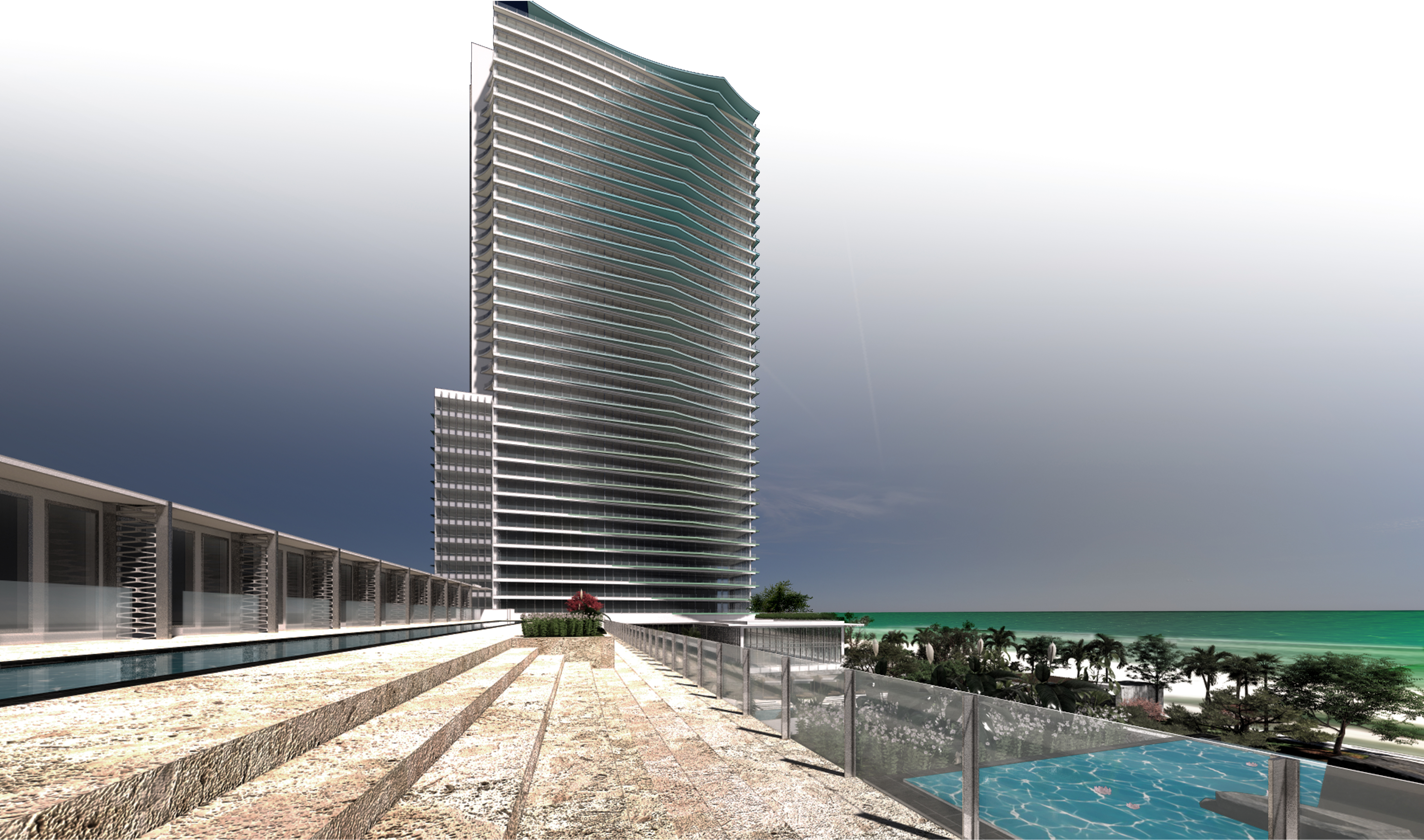 The design intent was to complement the building with elliptical lines abstracted from the original design. The original lobby featured an elliptical recess in the ceiling, as did the main dining room. The porte-cochere’s parabolic MiMO lines invited the conception of a gentle, gradual aluminum bris-Soleil extrusion at the main tower’s south balconies, which in elevation formed an elliptical line delicately accented by light and the viewer’s relative position to the building. As floors were added to the tower, the lines become an architectural expression highly visible from the south and east, colored with a slight gradation from soft blue to soft green, as a nod to colors present in the original building. In the west of the tower, the elliptical gesture was expressed as balconies defined a curve that changed through slight differences in balcony sizes. In the east, walls changing in sizeand profile also defined an elegant elliptical curve.