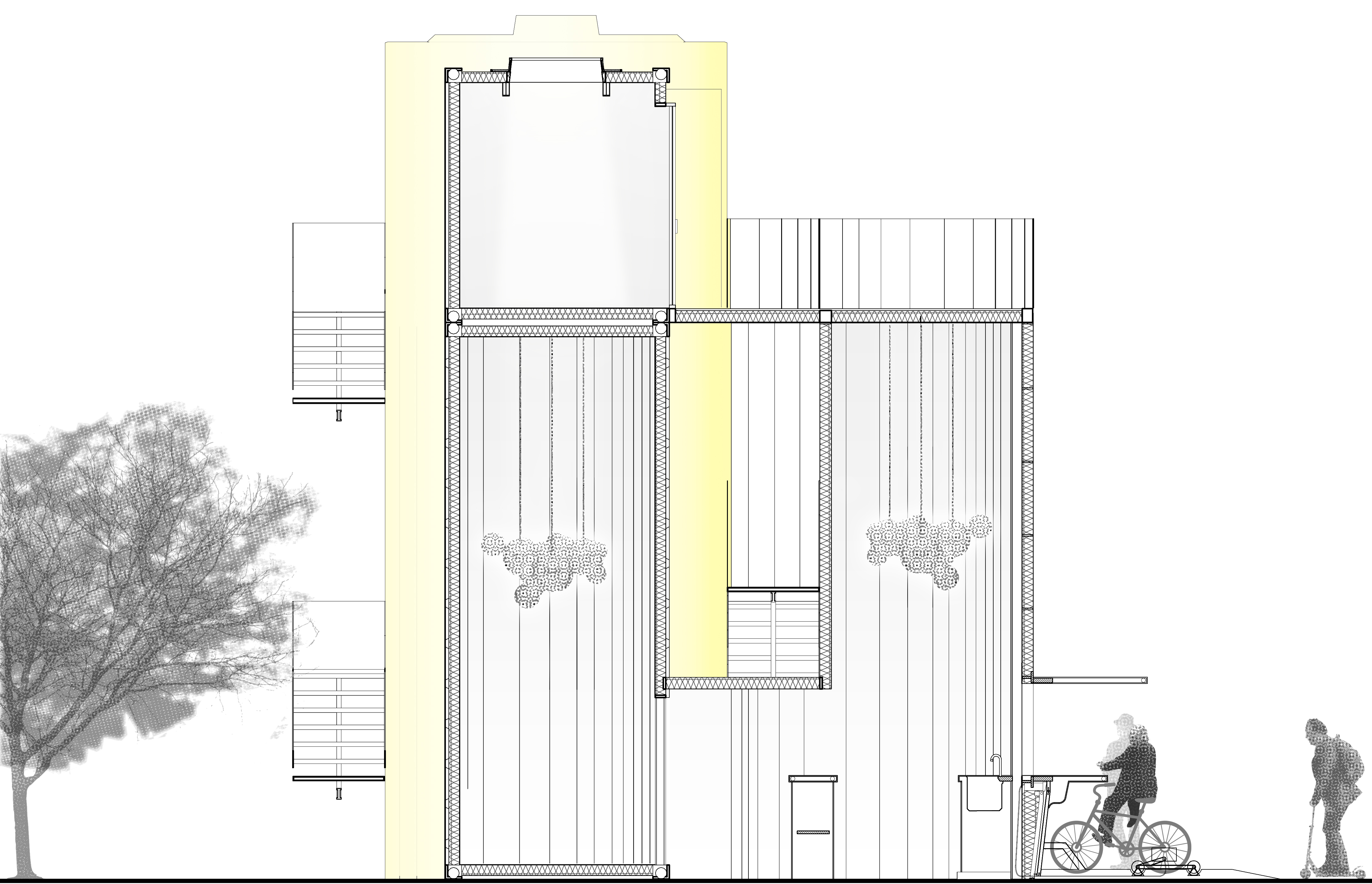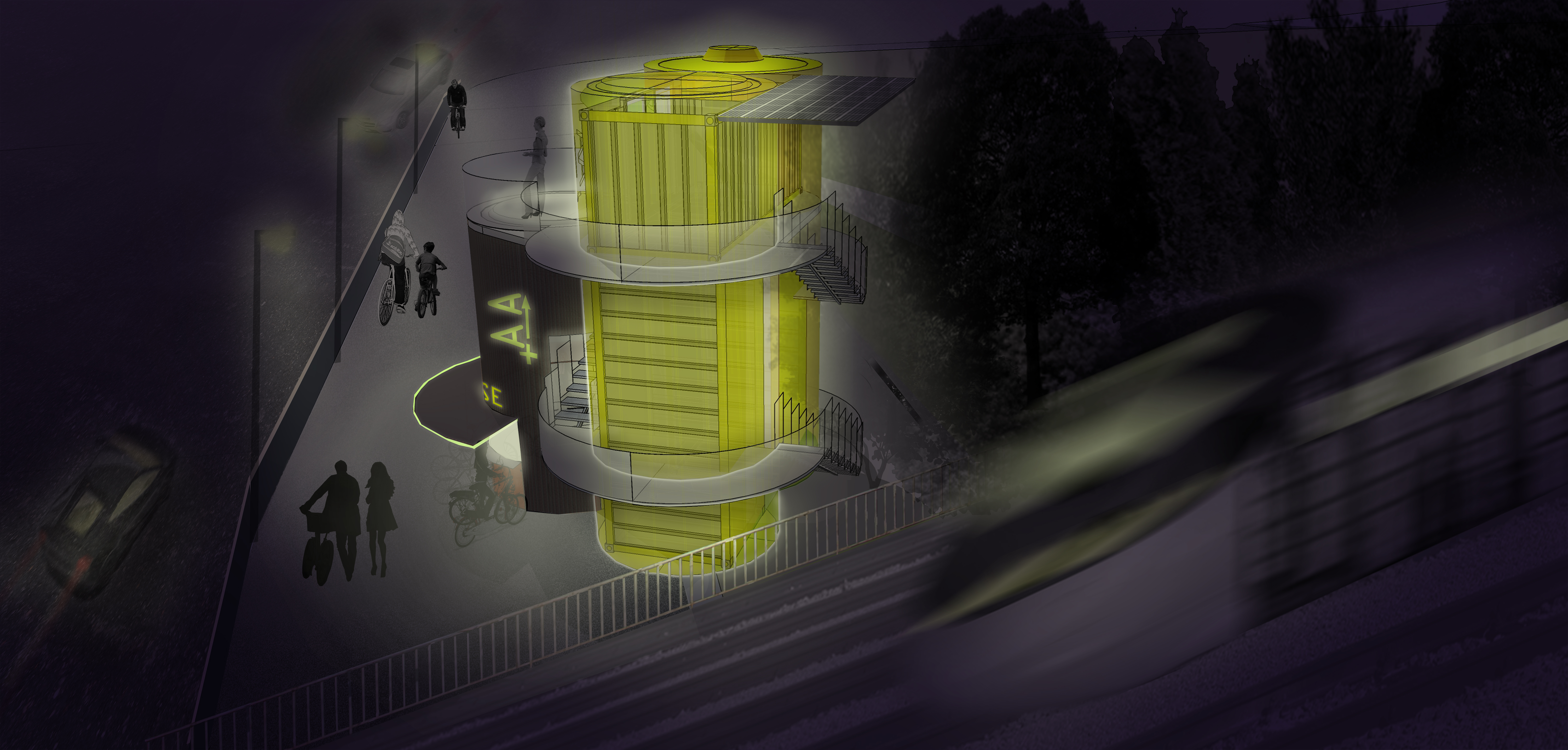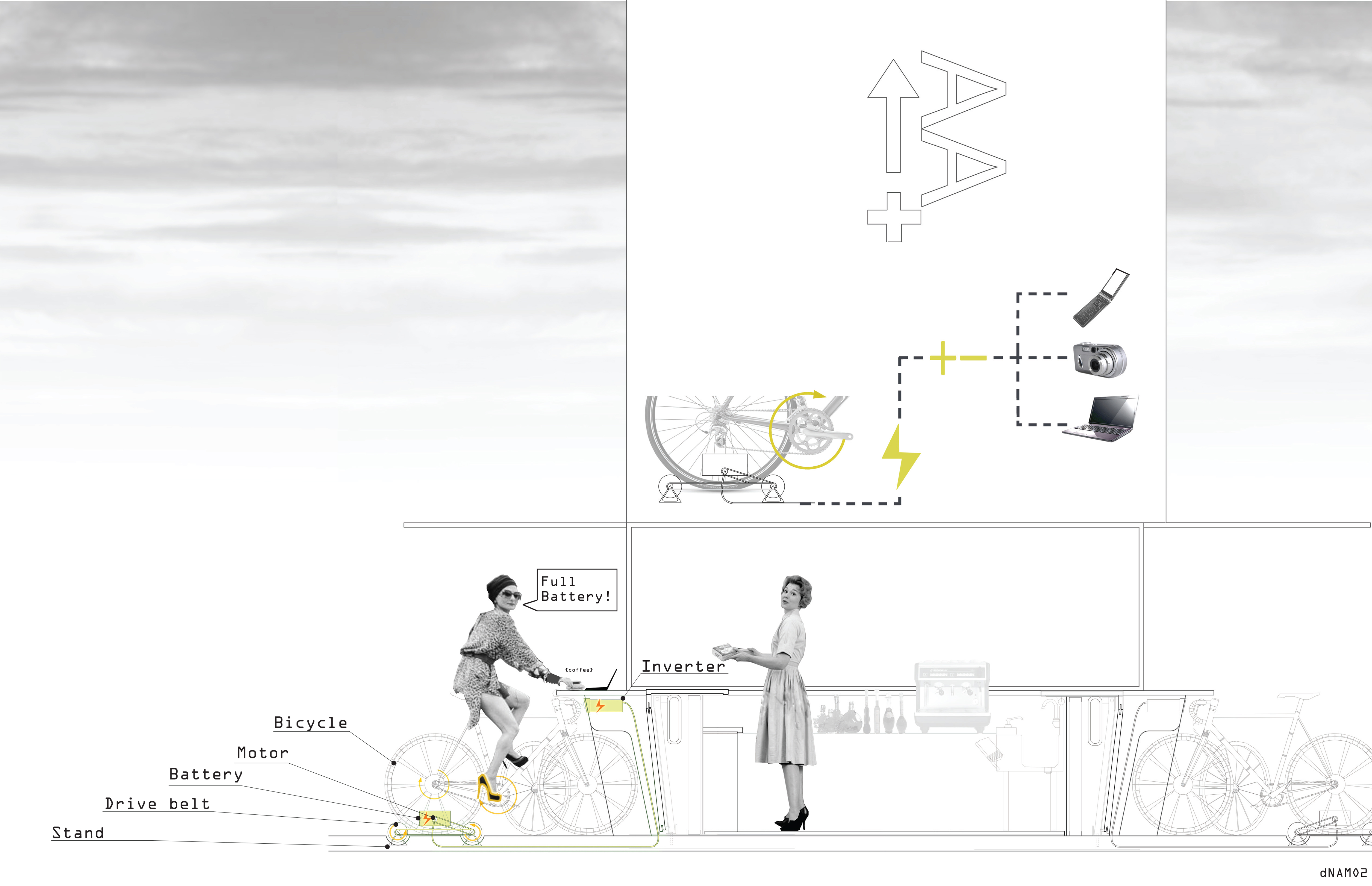 The third "battery", composed of vertically-mounted, insulated smooth profile curved panels with galvanized finish, houses the juice bar/pastry shop. Here, riders approach the bar area and place their bicycles on the stand. Once the bike is secure, they propel the dynamo at their own pedaling pace, powering their electronic device by using familiar and readily-available technology similar to that of the hand-cranked dynamo-based radio.