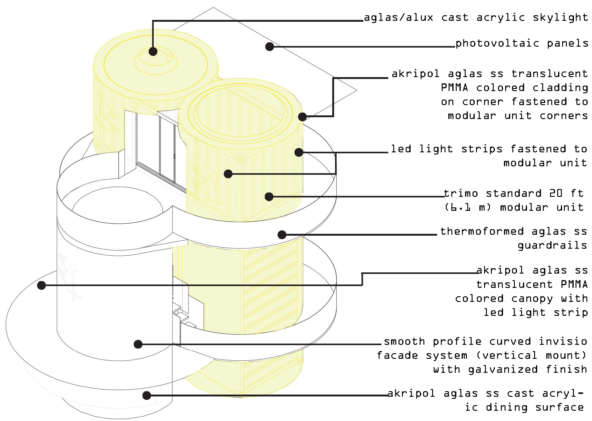 Three 20' standard modular container units create spaces for exhibit/seating areas and the bike quick repair shop. The three modules are encased on translucent colored cladding, which is fastened to the modular unit corners. The space receives natural daylight through the use of acrylic skylights.
