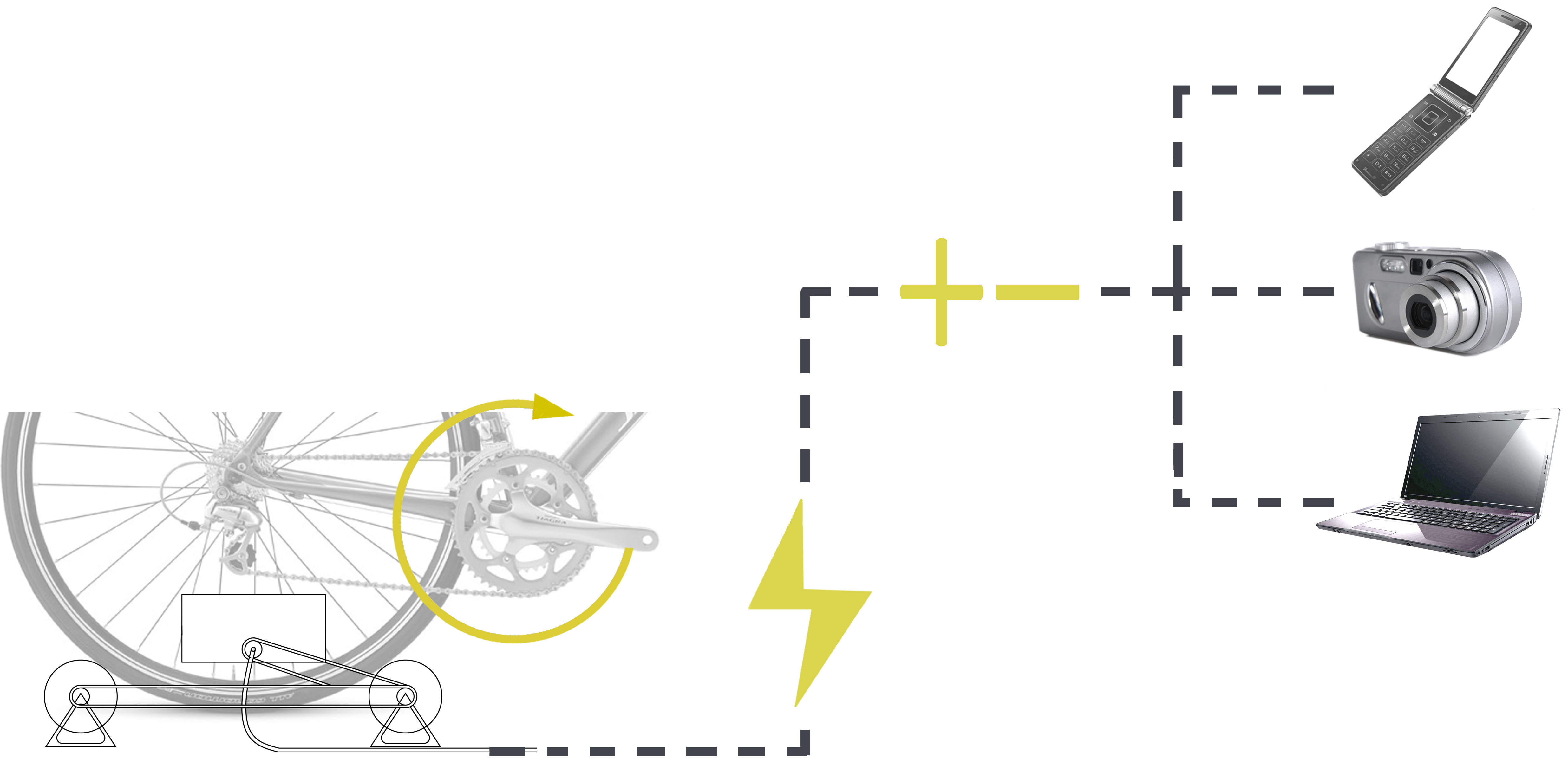 poetics which the bicycle's positive energy bring to the urban environment are embodied via human-recharged "batteries" made possible through