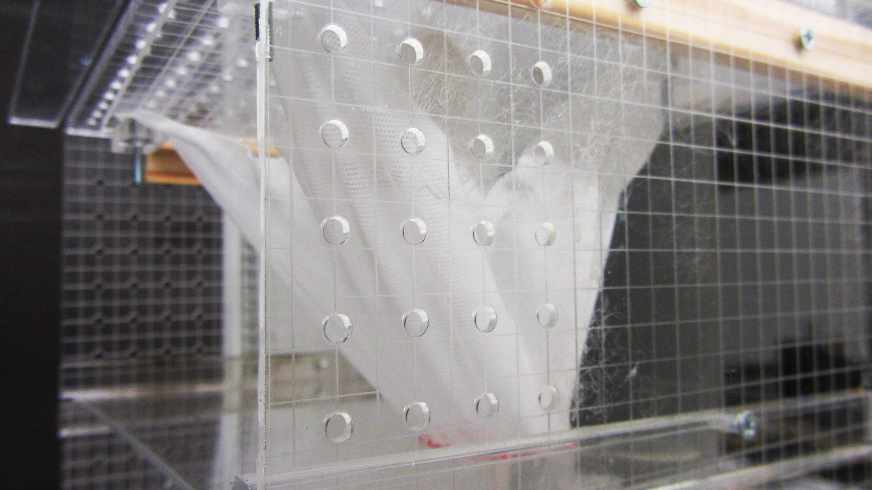Differing from the silk pavilion, the experiment was not an attempt to express future possible material applications, but to express possible organic interactions between parameters of emergent form-making and man-made materials. The juxtaposition of and the interactions between natural and artificial elastic fibers was secondary.