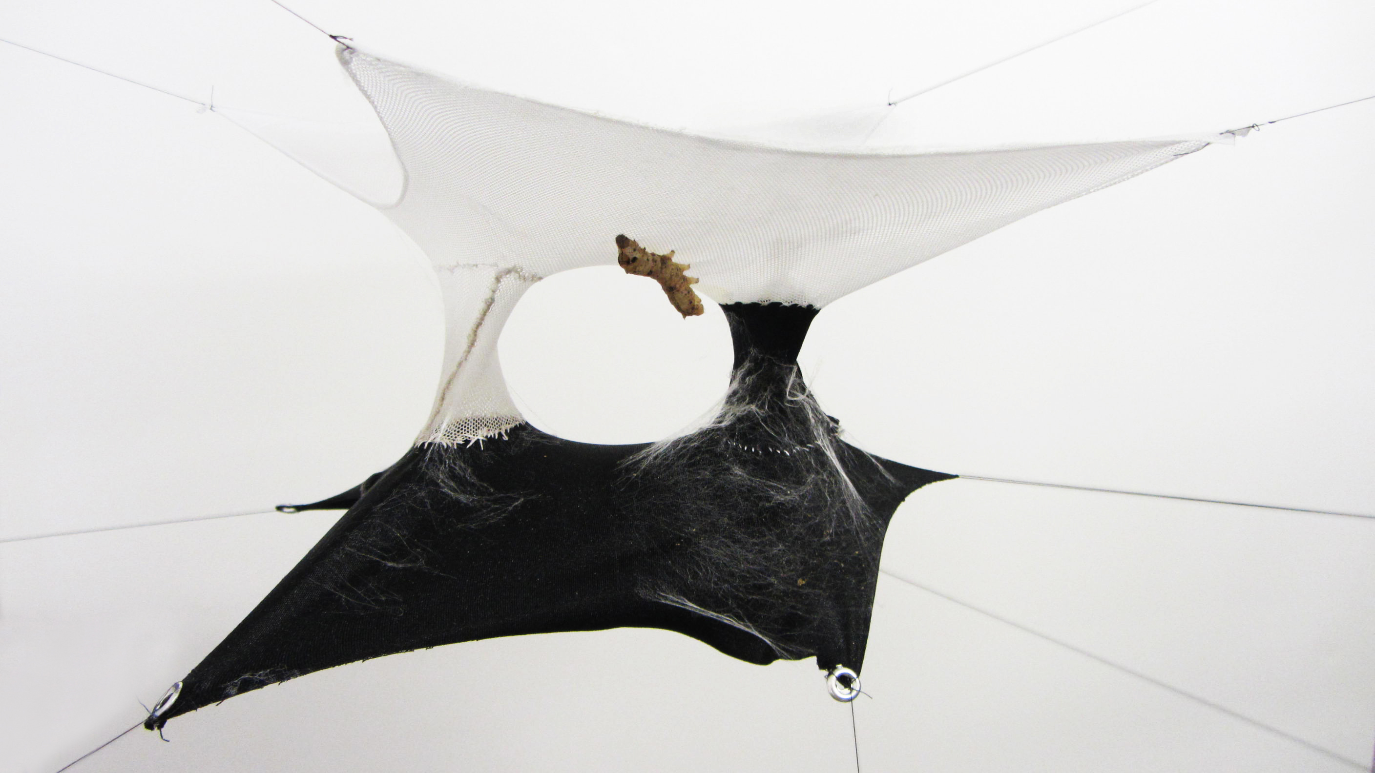 Initially, the experiment aimed to allow free agents to determine the fabrics' points of attachment, hence allowing form-making though a bottom-to-top approach, and starting with self-organizing, basic, independent and computational agents working together in a decentralized fashion. Live silkworms were introduced to the study aiming for this approach, resulting in a system that expresses the juxtaposition of the form made by the agent -as shaped by its natural, goal-oriented reasons- with elastic fabric media.
