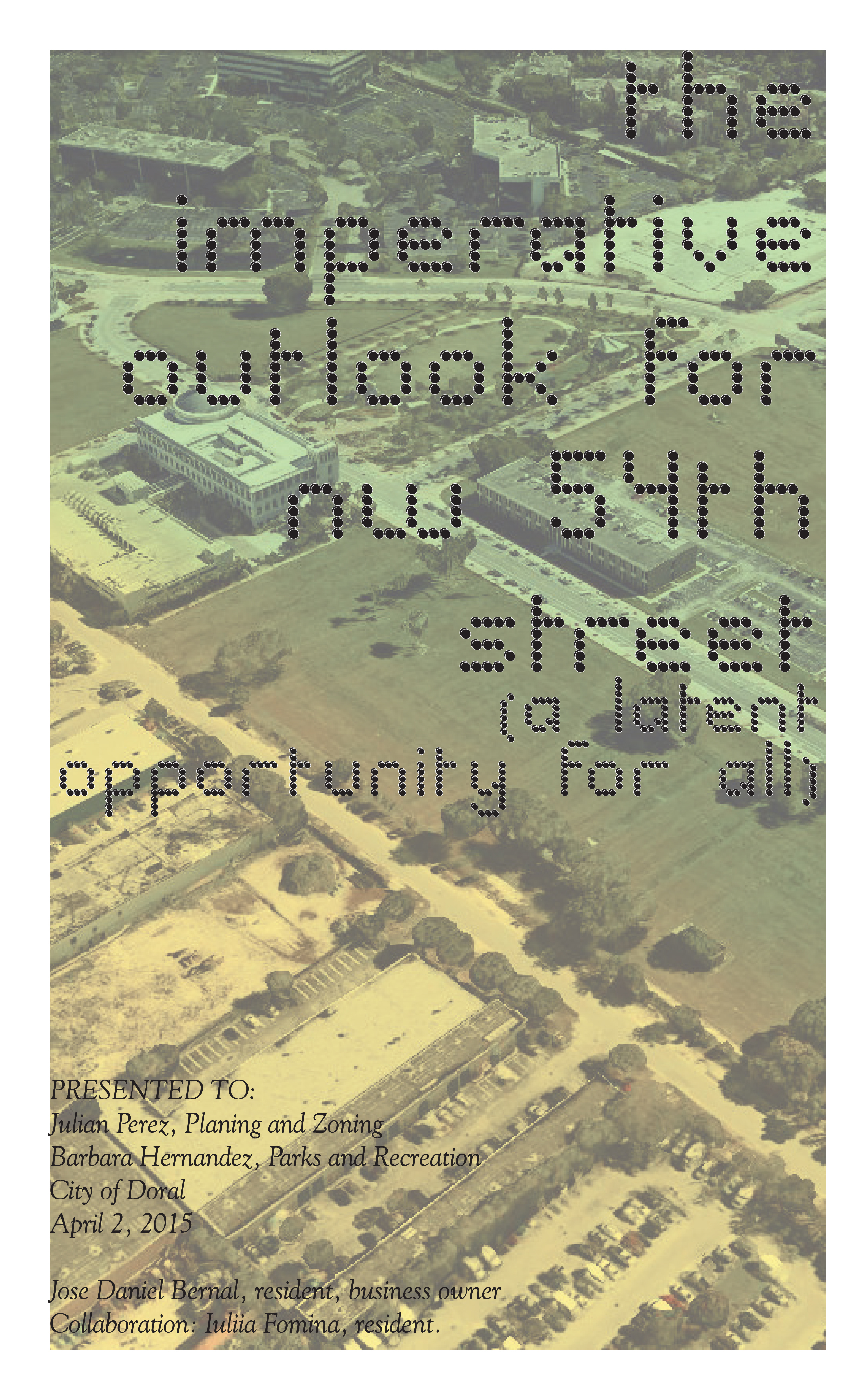 As former residents of Doral, we hope to see the city not just expand, but grow. This initiative is our contribution towards that goal. We have created an analysis of the conditions that can make NW 54th street an incubator of a cultural district for the city, and