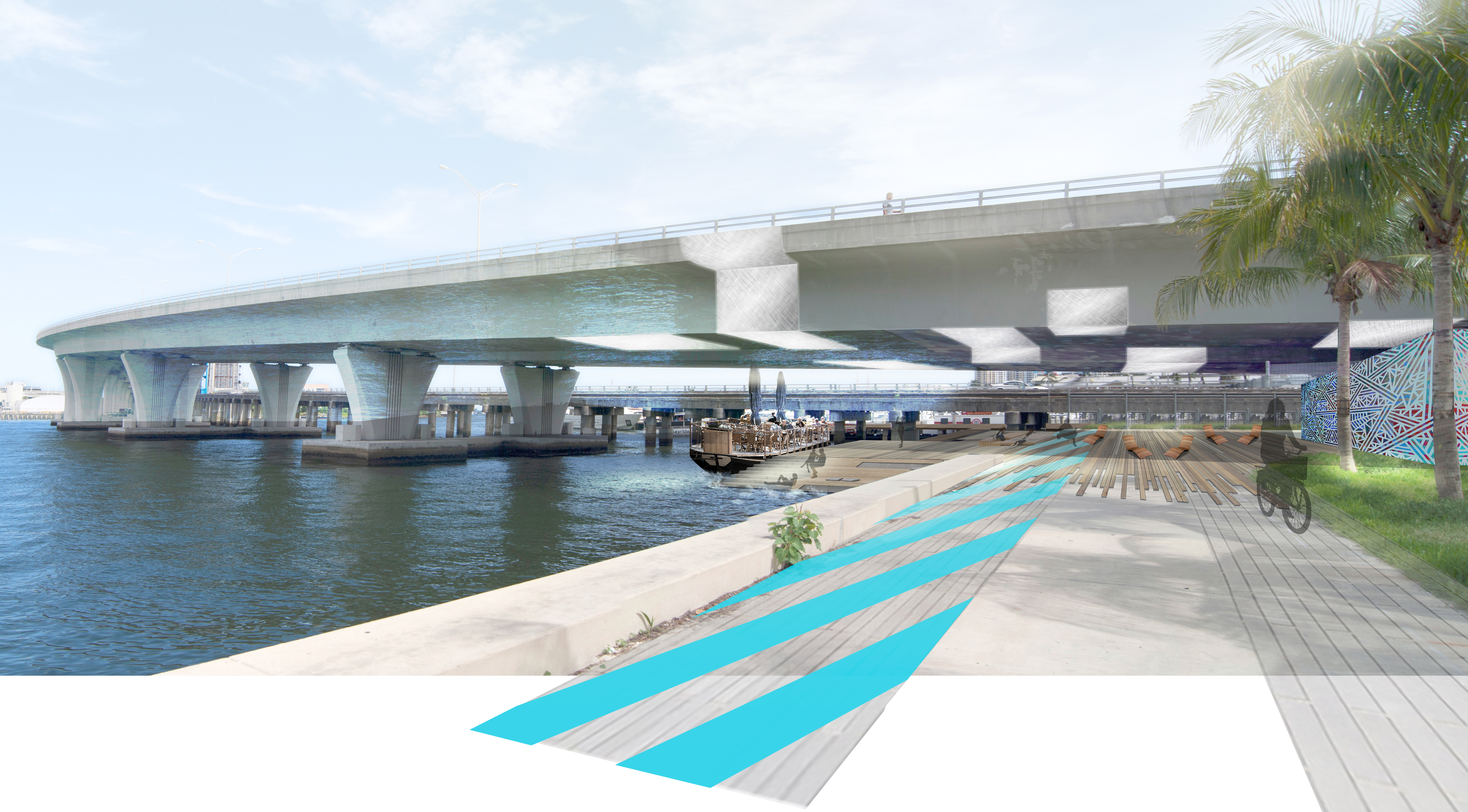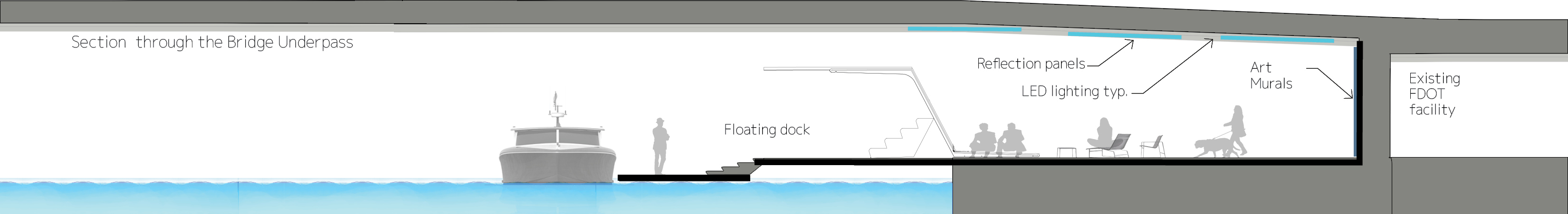 The absence of light contributes to the sense of lack of safety and comfort at the Port Bridge underpass, an important link between destinations of ourRiver Roam proposal. The proposed floating dock provides continuous pedestrian connection and attracts small businesses such as food boats and water taxis. The proposed polished metal sheets fastened to the underside of the existing Port of Miami bridges reflect the sunlight bouncing off the water, dispersing as shimmer that creates a surreal and calm marine atmosphere. At night, LED lights on the bridge underside and on the water surface create an inviting atmosphere.