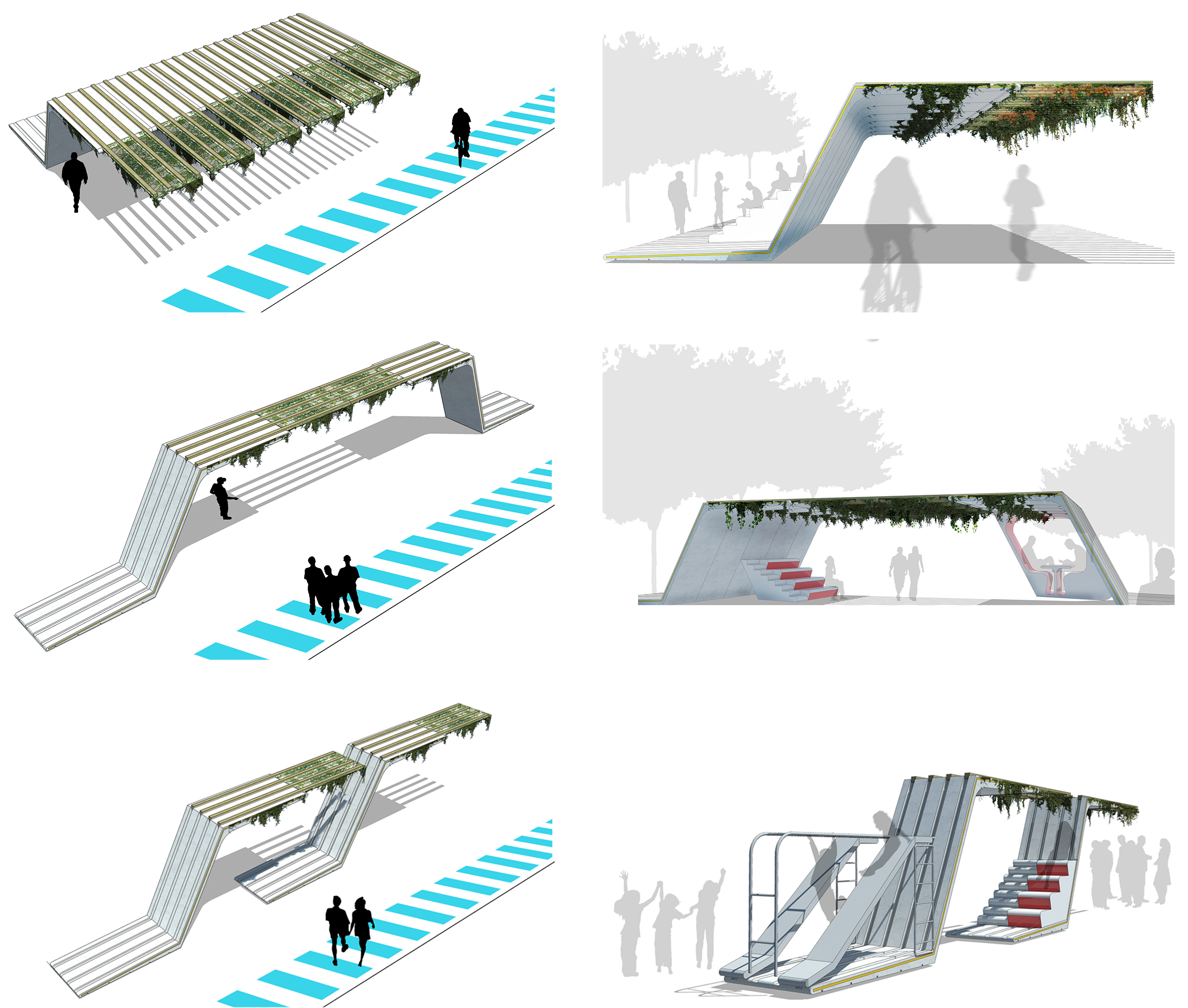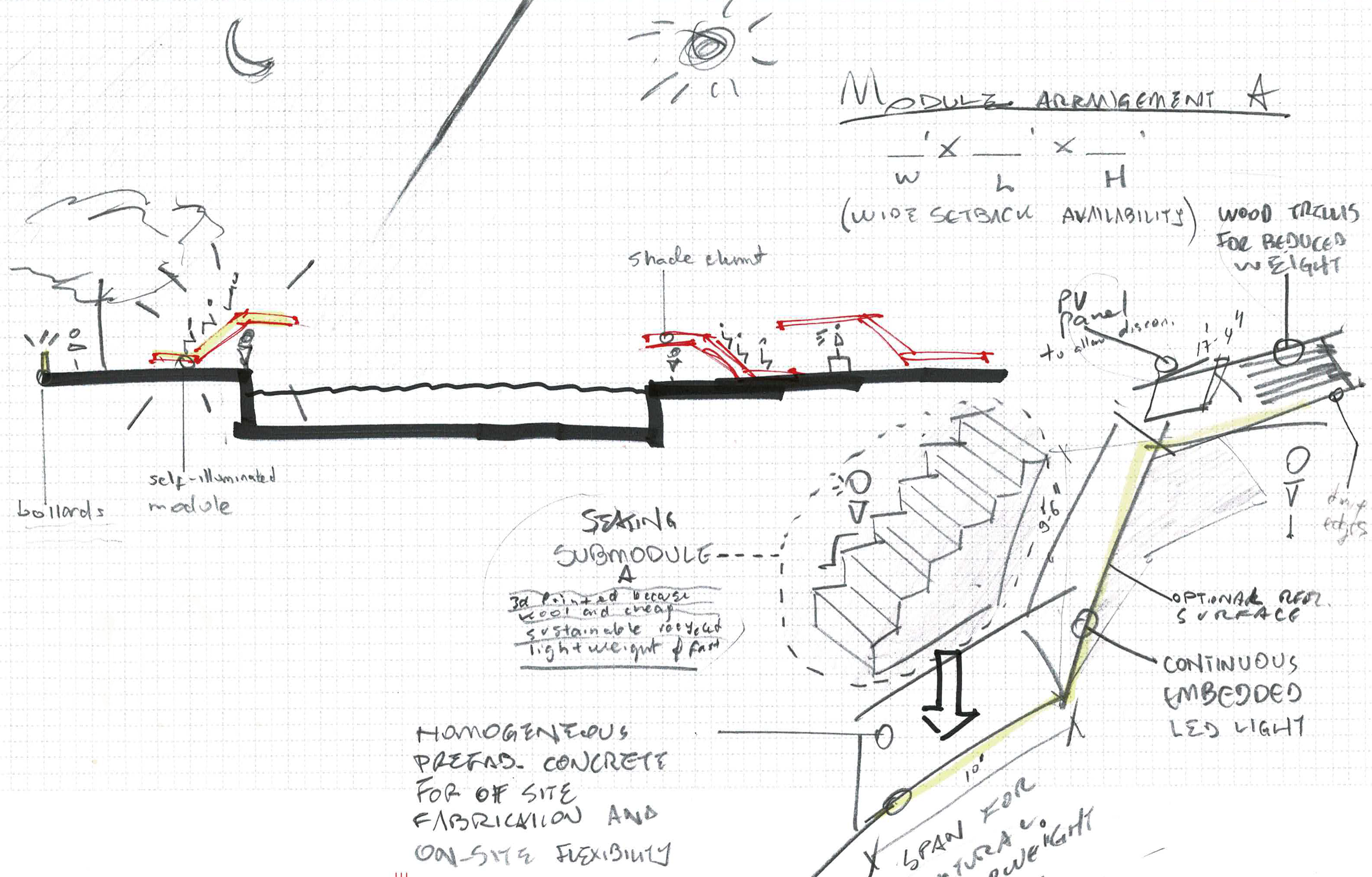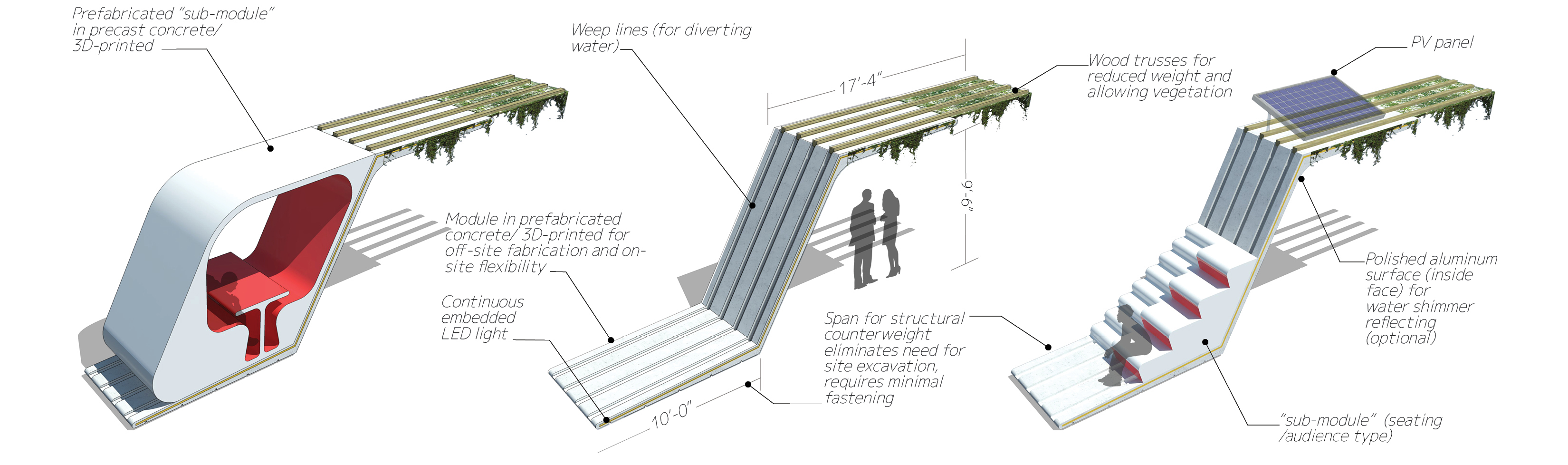 Modularity assists in reducing cost, maximizing flexibility and avoiding site excavation, as the modules are held in place by structural counterweight. Prefabricated “sub-modules” assist in the structural counterweight and in creating activities. These may be dining tables, audience seating, children’s playgrounds, outdoor fitness devices, planters, art murals, etc. In lieu of precast concrete, the modules or the submodules could take advantage of 3D printing technologies, which now have reached building scale, are economical, require less energy to fabricate, reduce construction time, require less labor and utilize recycled materials. The modules can be fastened or removed for storm events.
