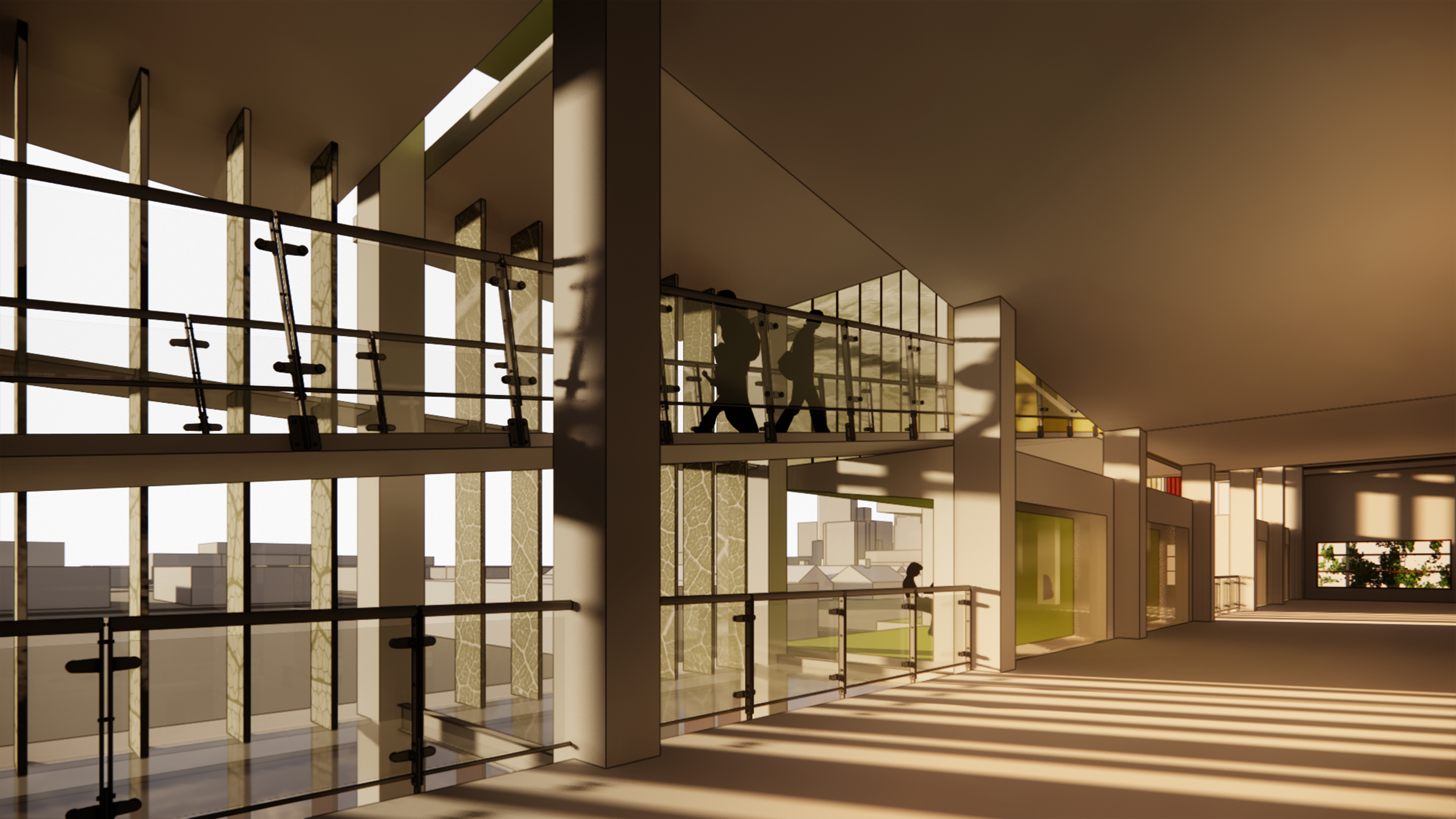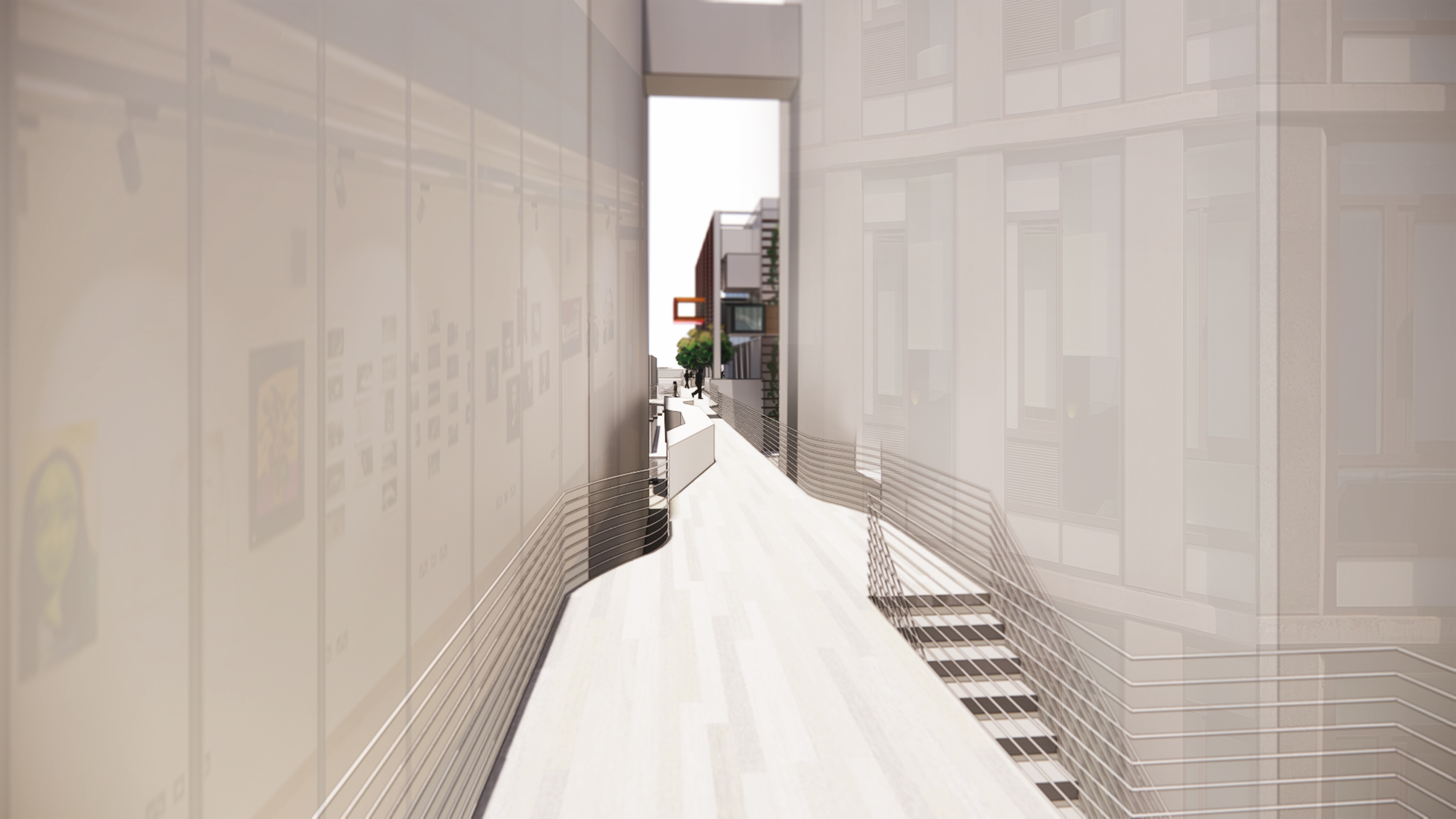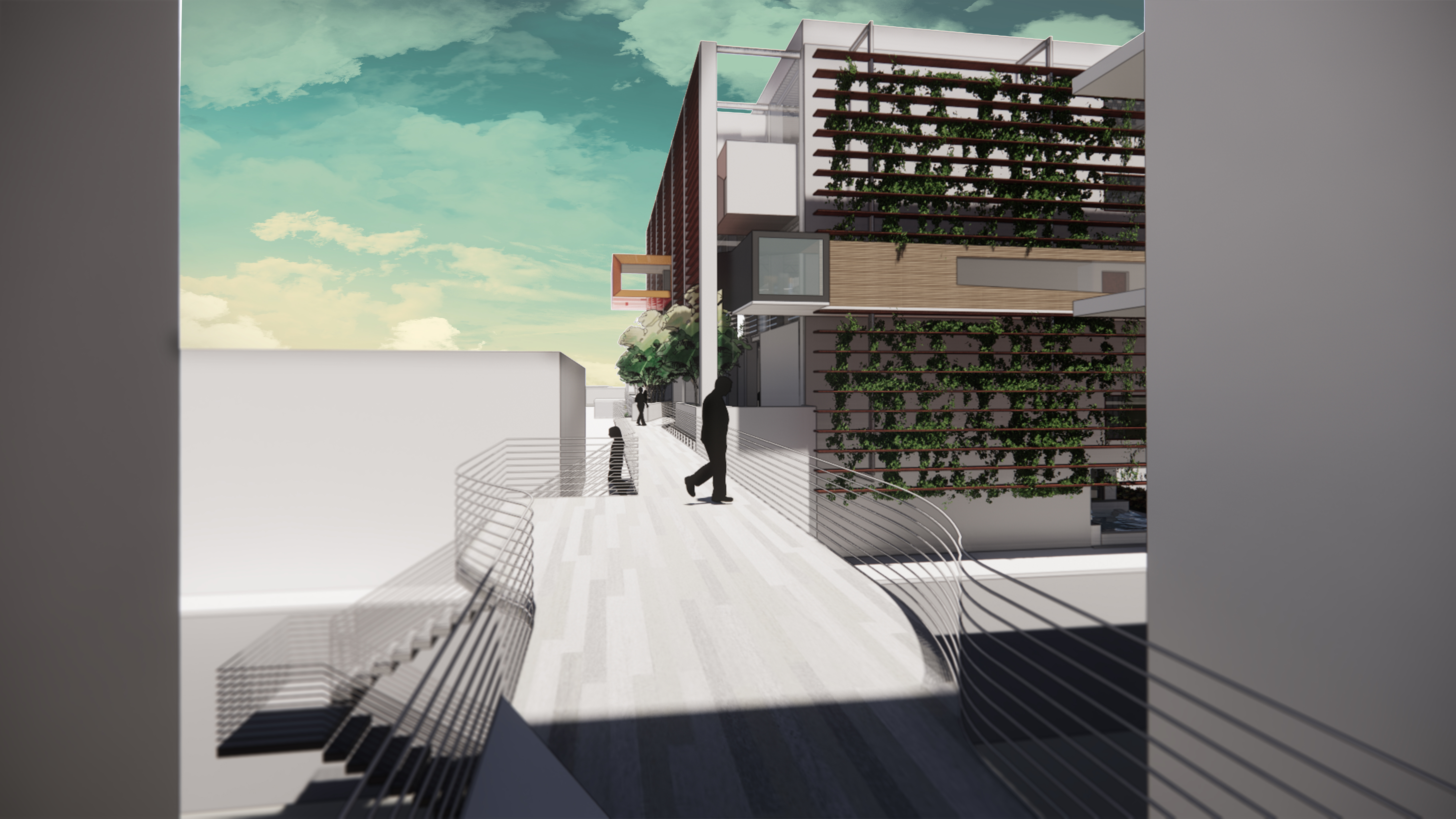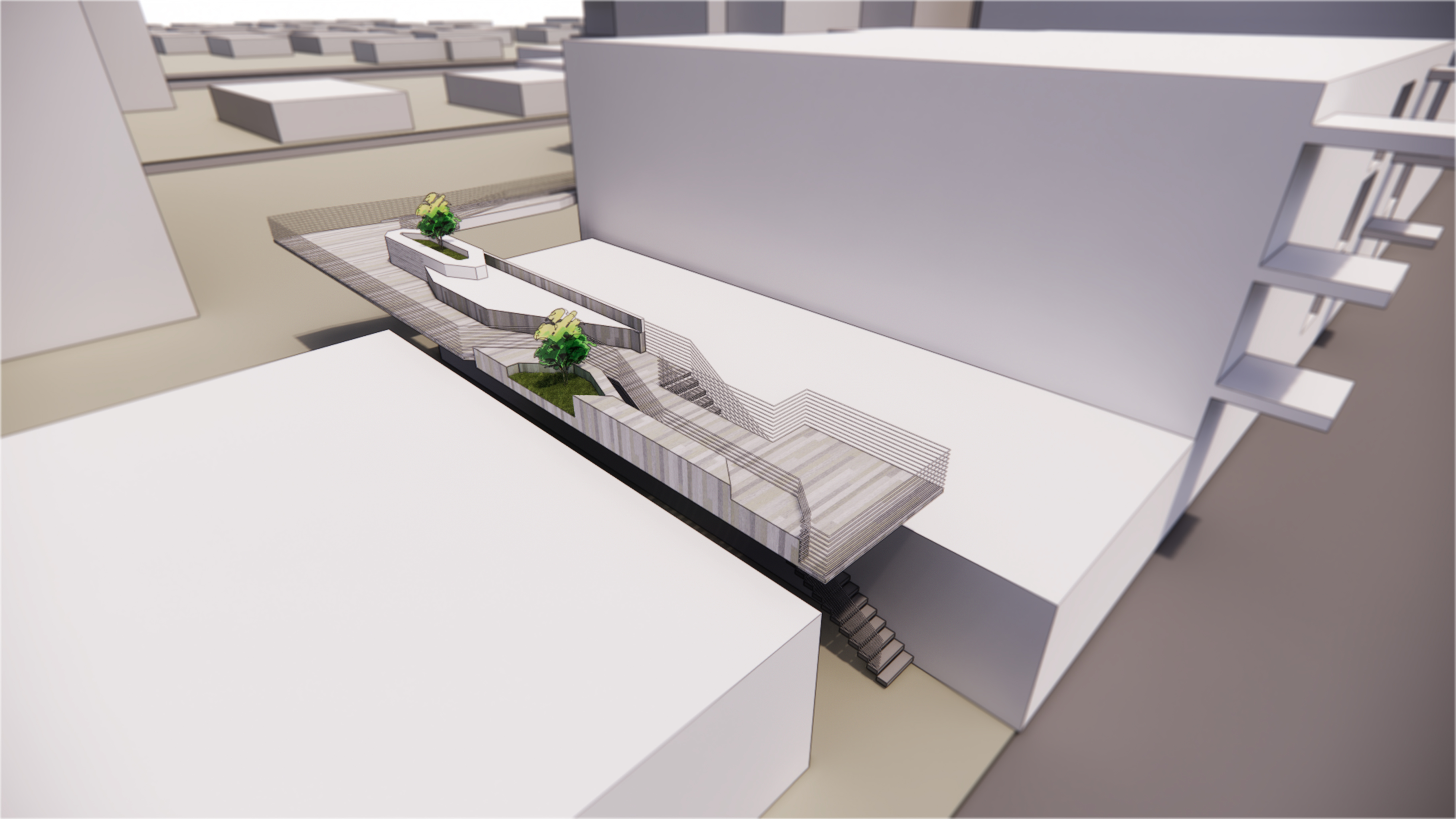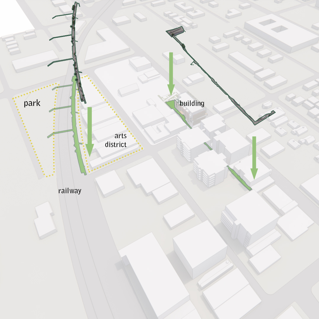 The proposed elevated walkways provide multi-level connections between the building and the street, as well as over the railroad and into the currently decaying public park, just west of the site. These links seek to remove blight and barriers from the railway. There emerges a symbiotic opportunity to the neighboring art galleries to further become nodes of activity, the art movement specific to the neighboring FAT arts district being catalyst of possibilities for urban engagement. Conceived from this reaching out, the building itself calls upon earlier examinations of the concepts of abandoned/ constructed/ cleared site.
