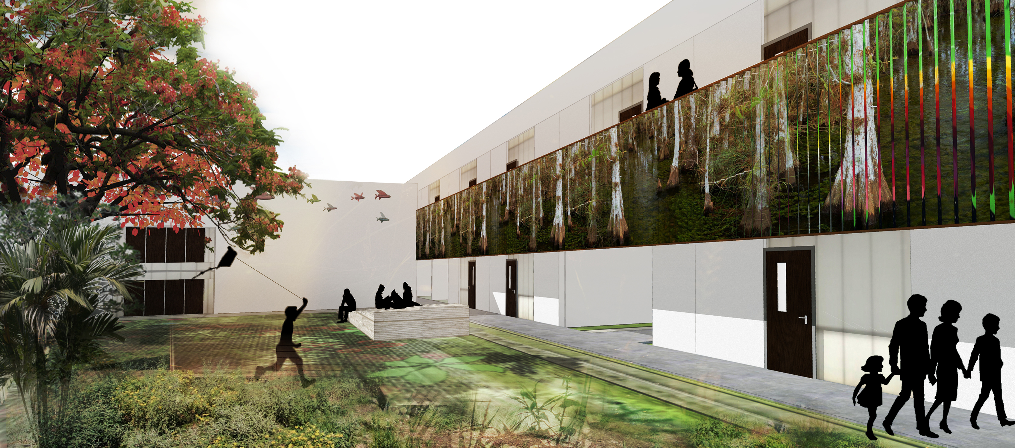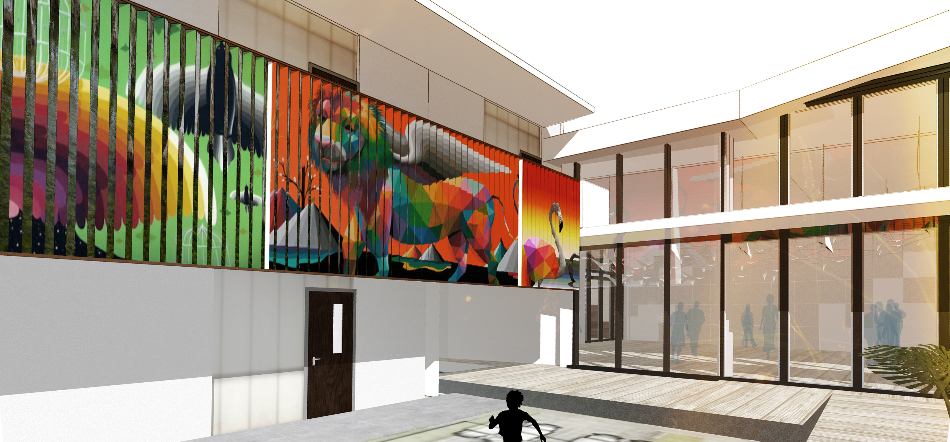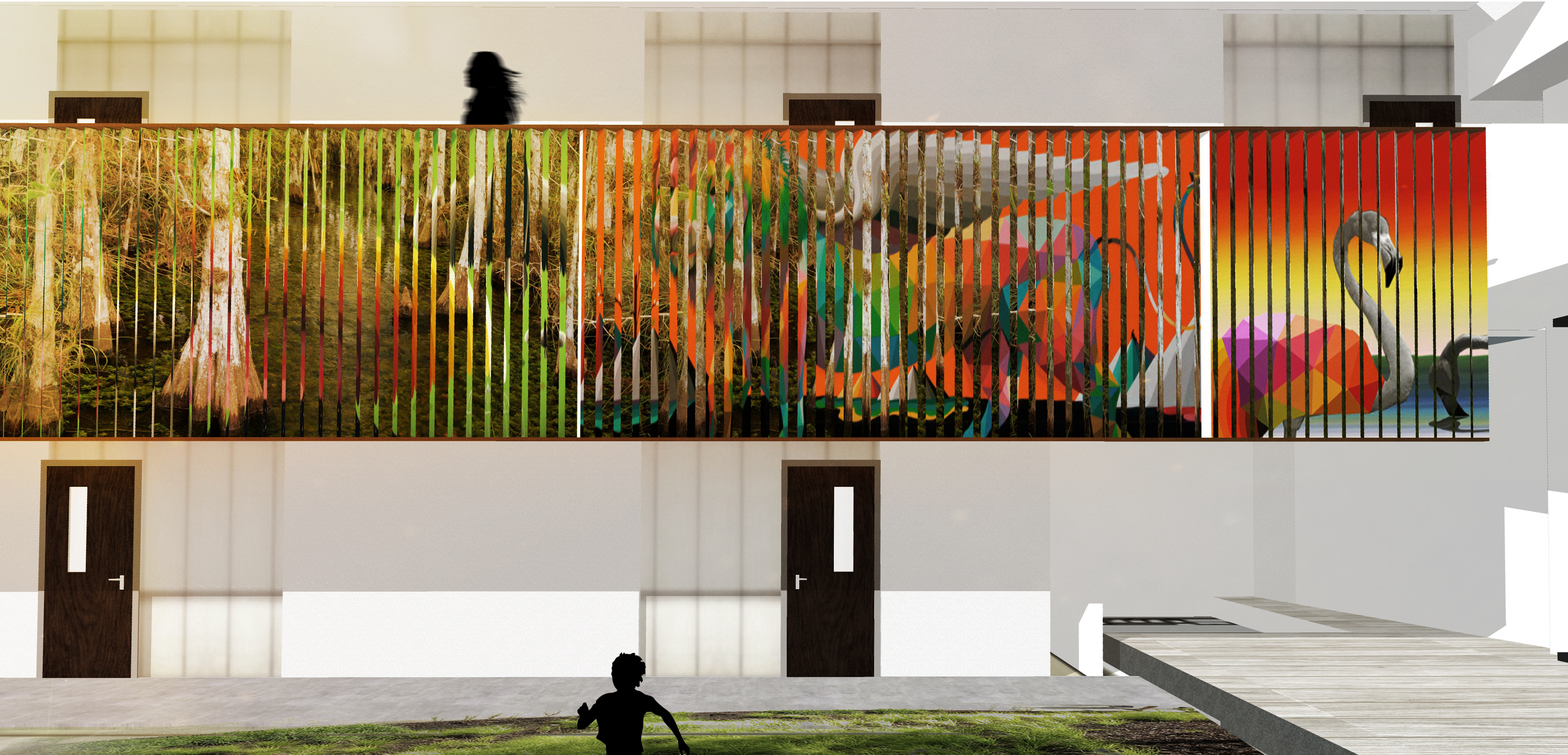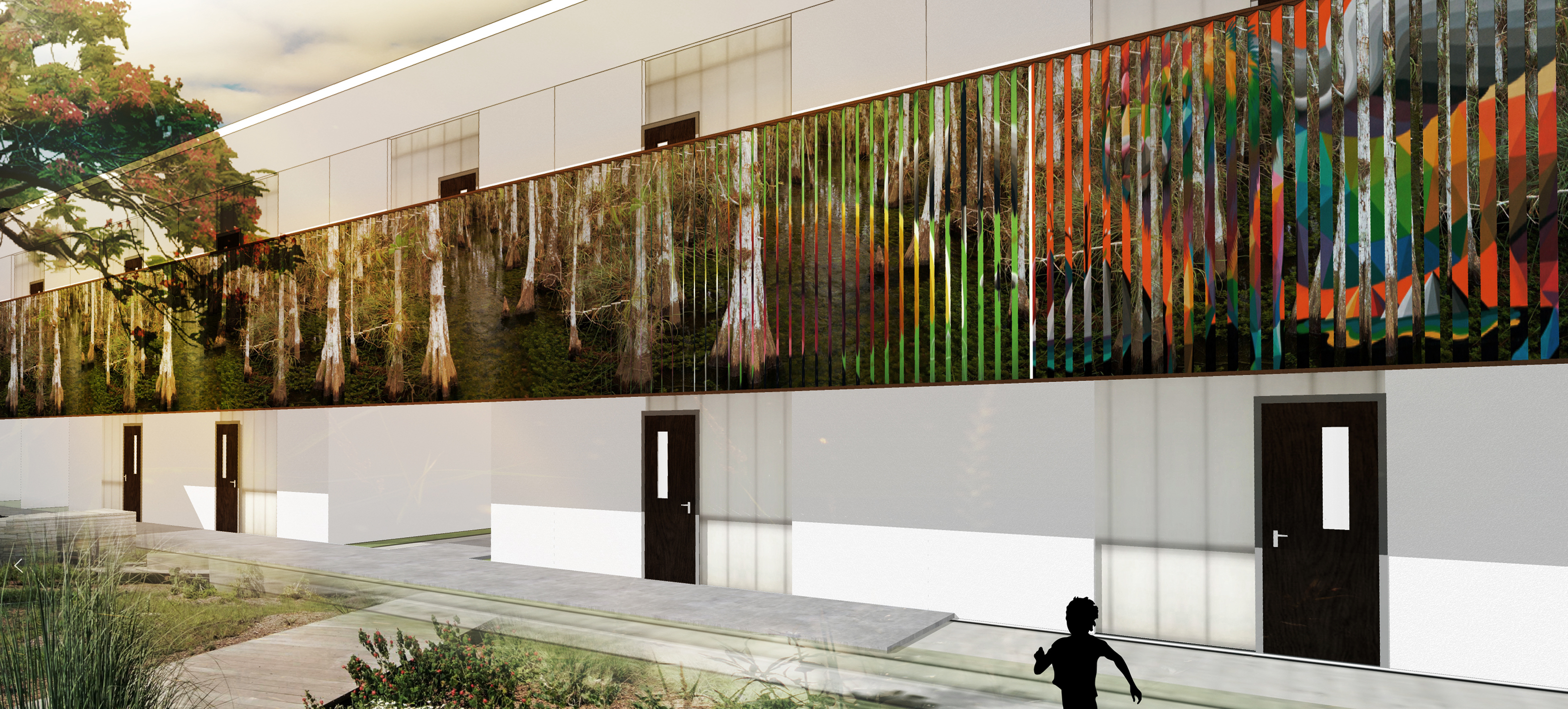 As perimeter to the classroom yard, V-shaped aluminum screens generating a lenticular effect serve as walkway guardrails, while displaying two printed images alluding to Florida landscapes and to children’s themes. This effect can be seen from the nave and from the school, as the image swhitches from one to the other as the viewers move around the spaces.