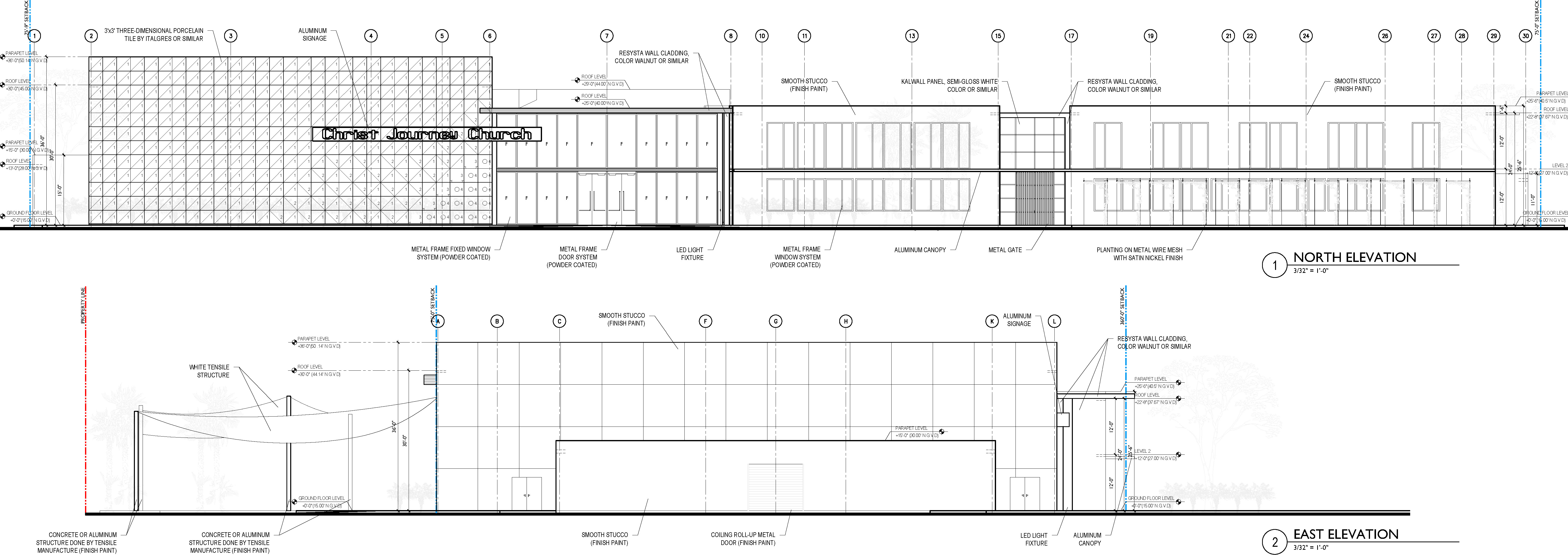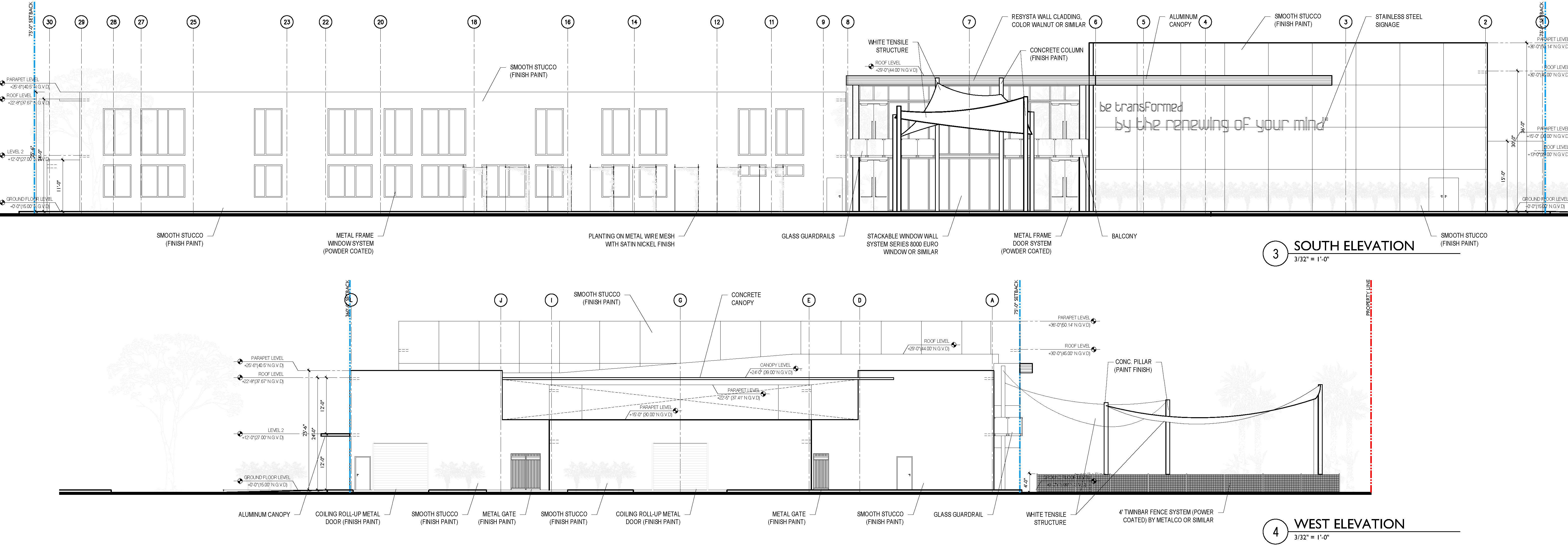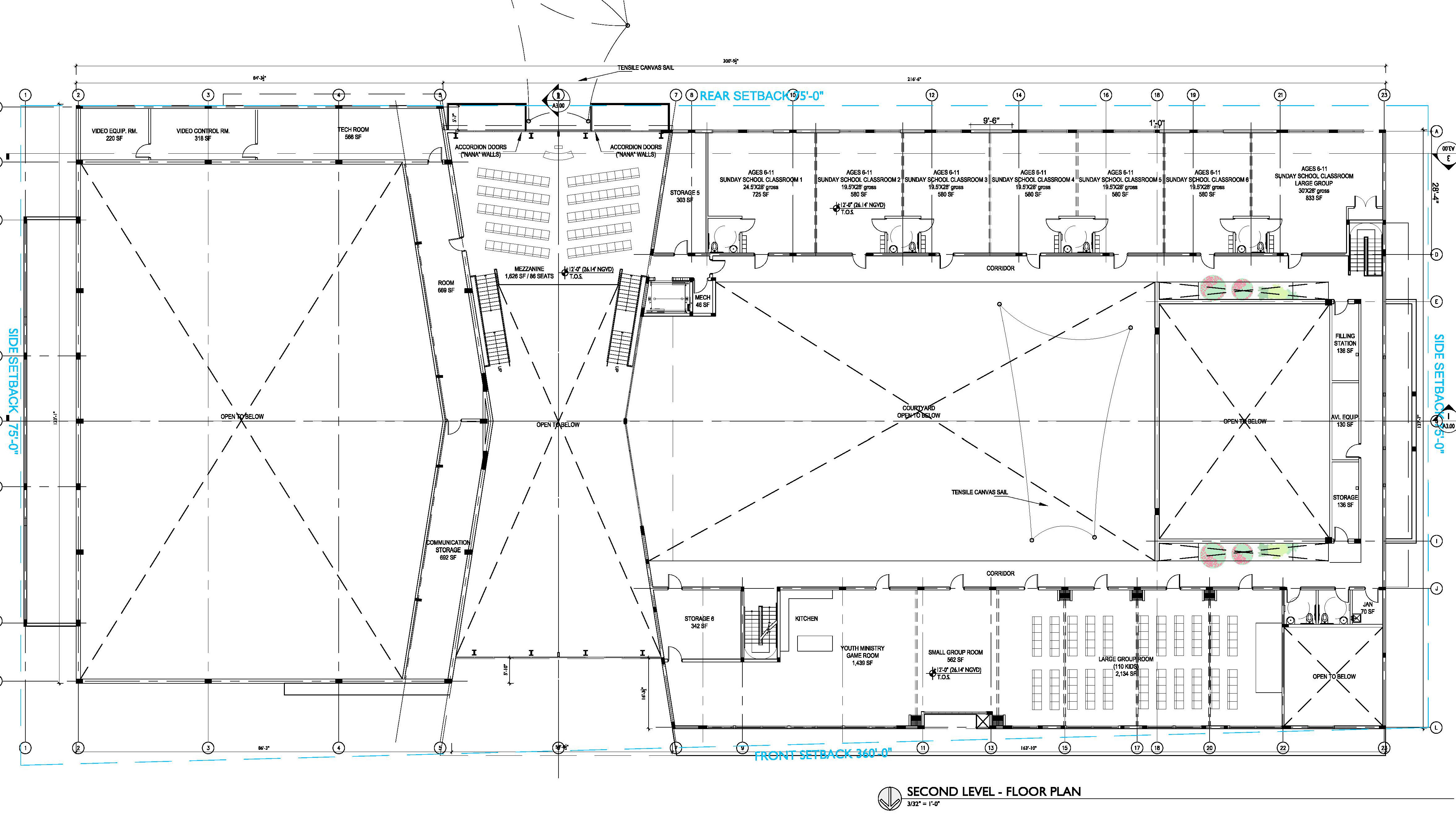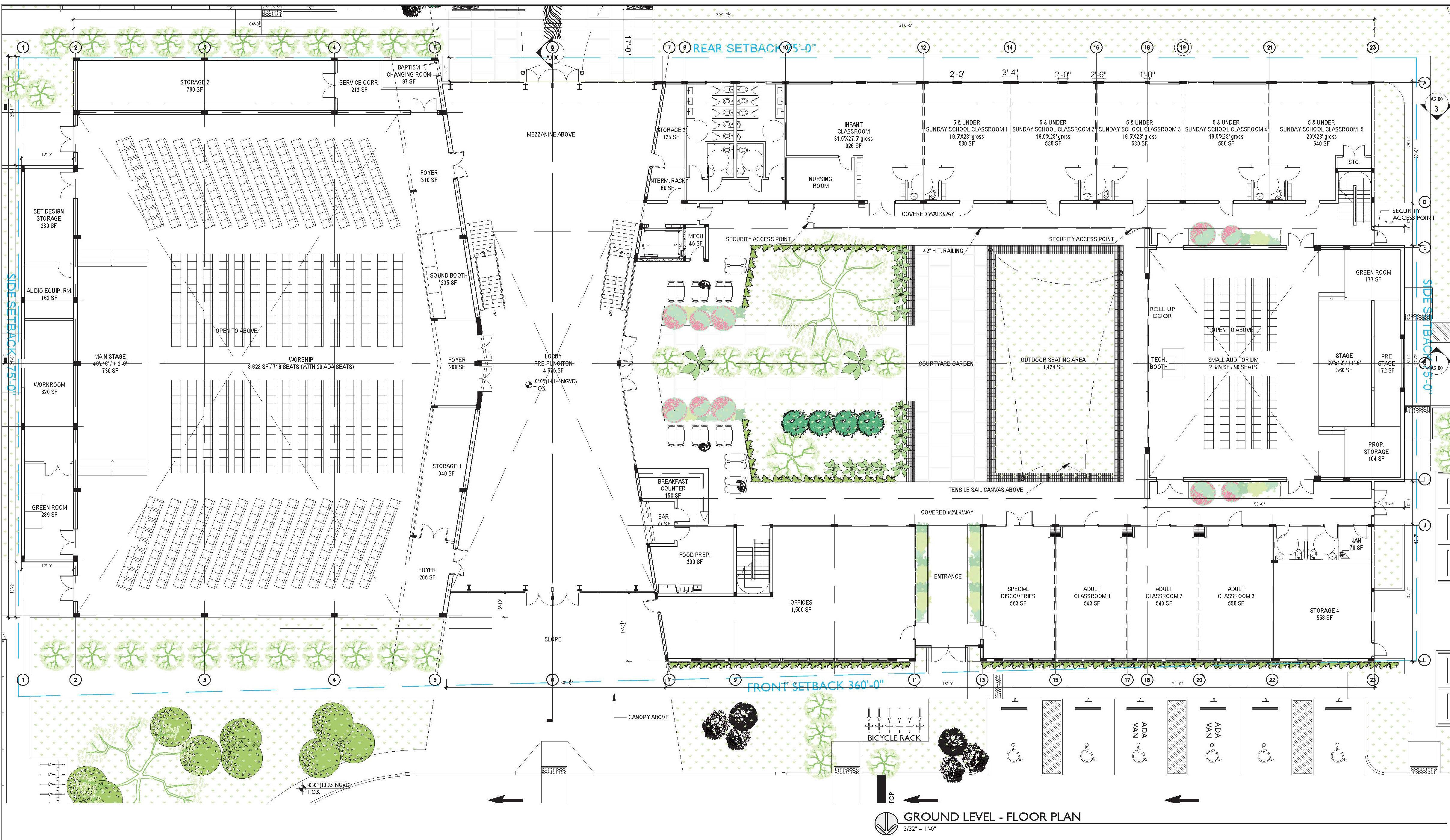 This metaphor is given form through highly flexible spaces that allow a multitude of integrations. The physical experience of the traditional planar, static nave was reassessed and the nave’s role was expanded beyond its culmination in a traditional pulpit. The proposed nave folds upwards, conceiving a celebration stage (mezzanine) which connects with the outdoor bapstimal fountain in the back though the use of a folding storefront system, and with the nave in the front as required by the event. The nave also employs a folding impact-rated storefront system facing the lush school yard, inviting its vibrancy to flow into the space when the event and the weather allows.