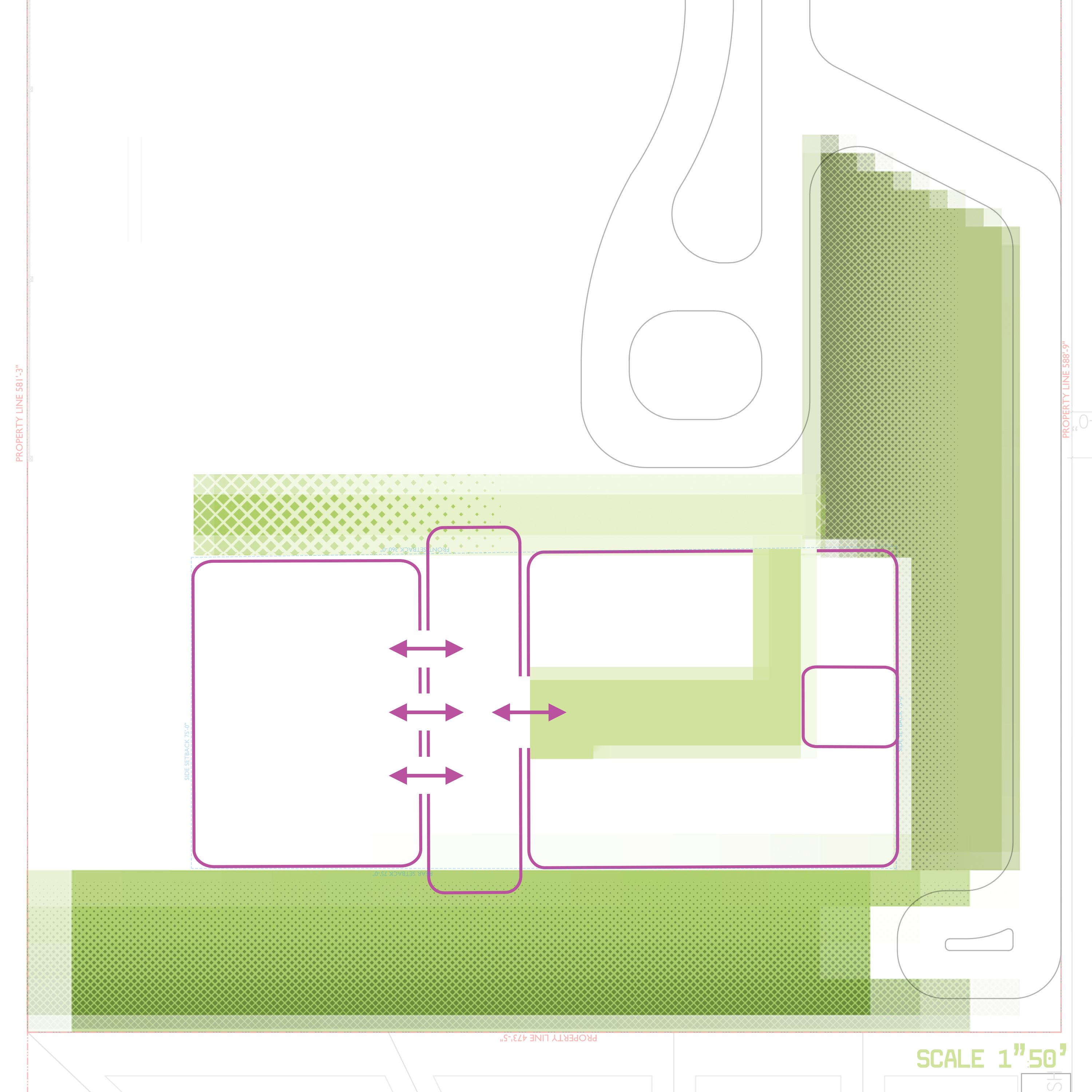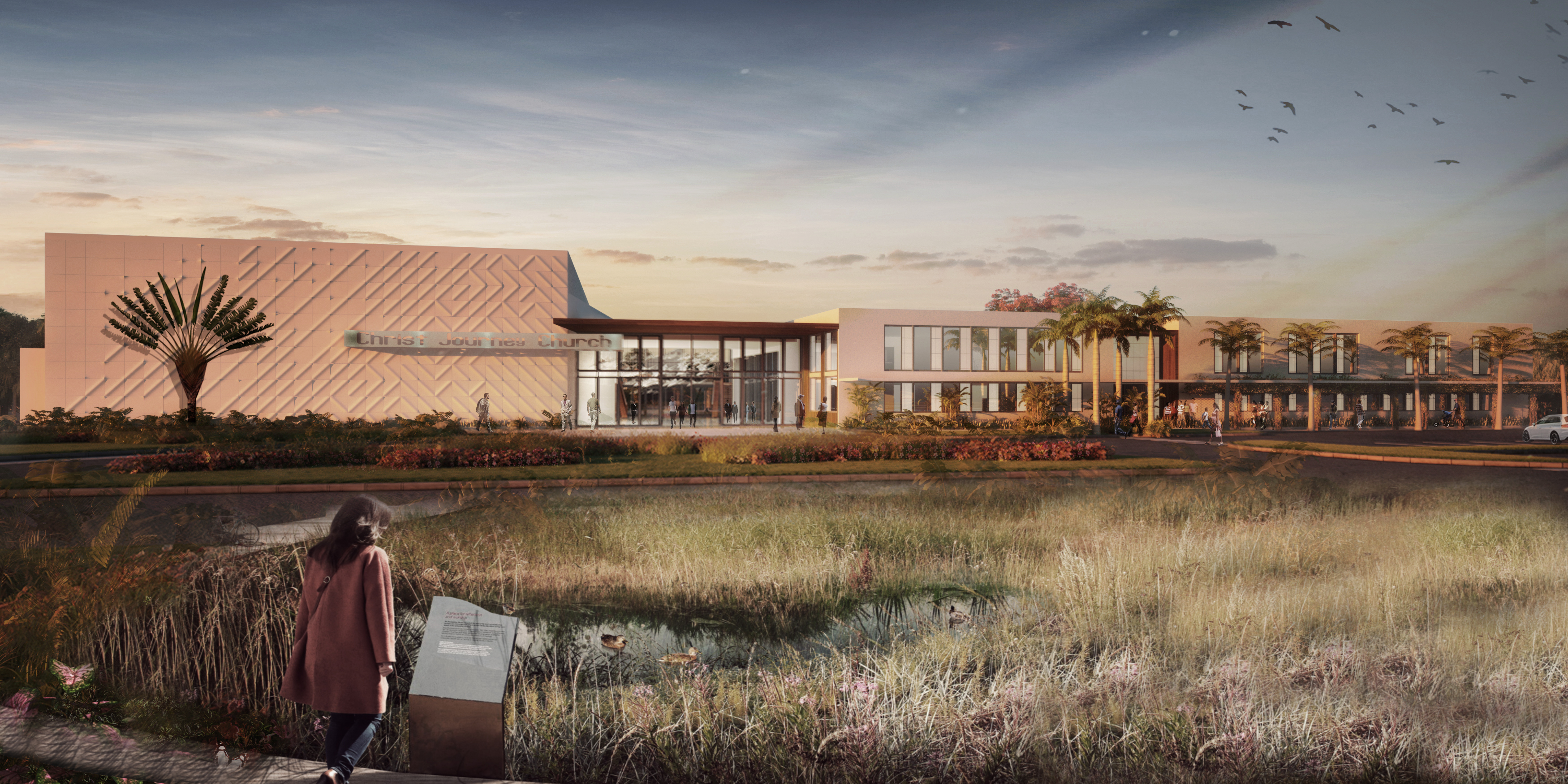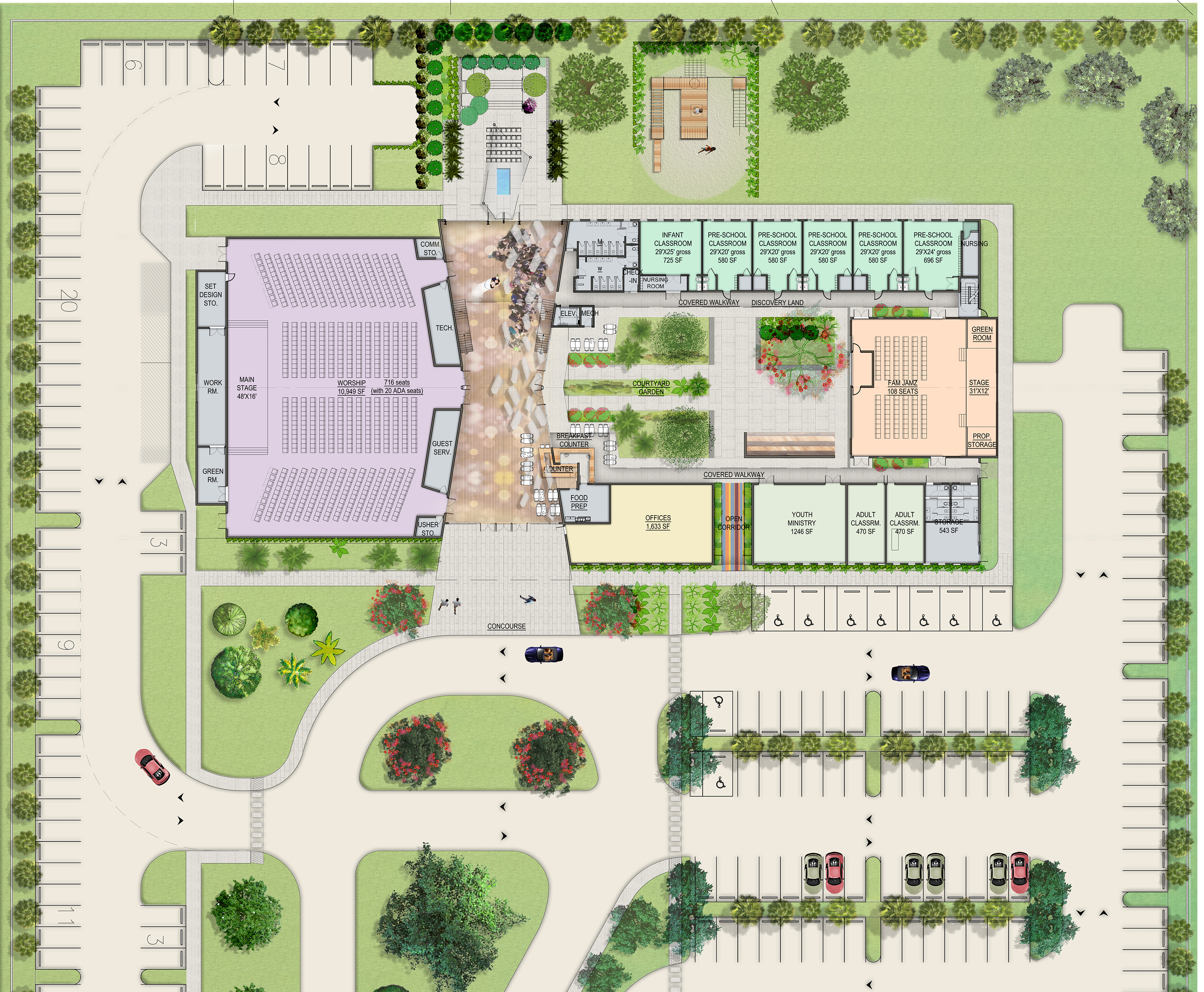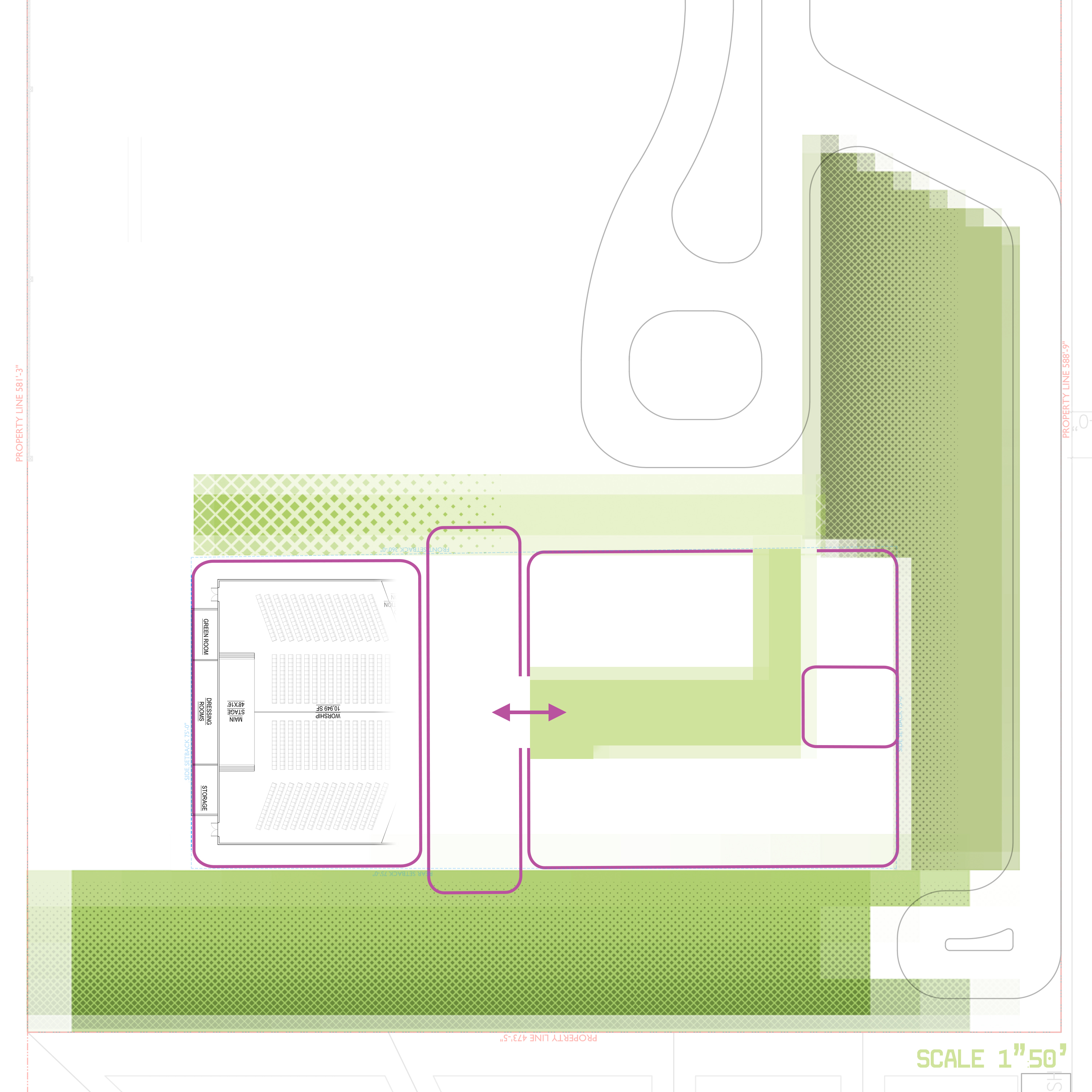This metaphor is given form through highly flexible spaces that allow a multitude of integrations. The physical experience of the traditional planar, static nave was reassessed and the nave’s role was expanded beyond its culmination in a traditional pulpit. The proposed nave folds upwards, conceiving a celebration stage (mezzanine) which connects with the outdoor bapstimal fountain in the back though the use of a folding storefront system, and with the nave in the front as required by the event. The nave also employs a folding impact-rated storefront system facing the lush school yard, inviting its vibrancy to flow into the space when the event and the weather allows.