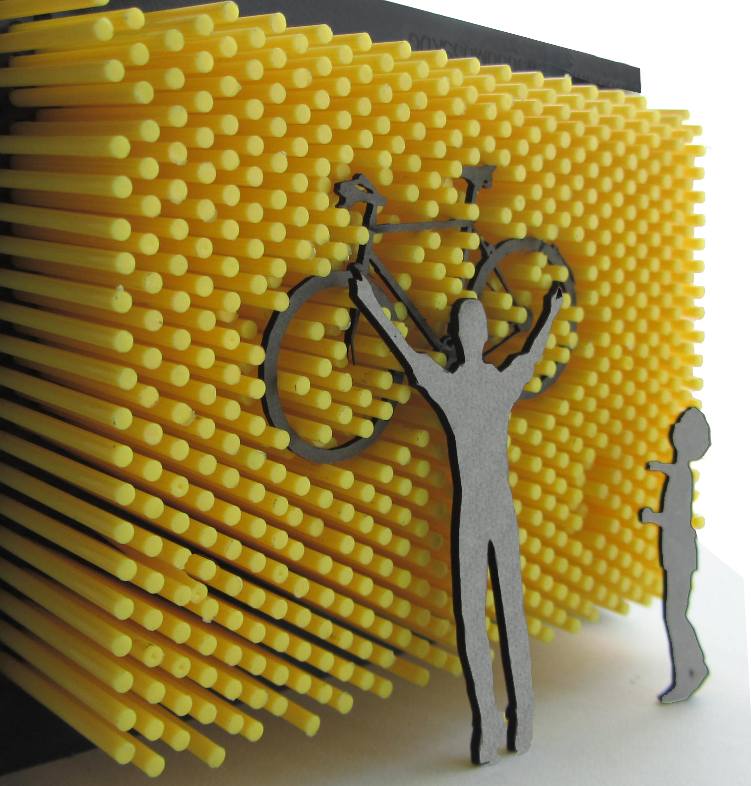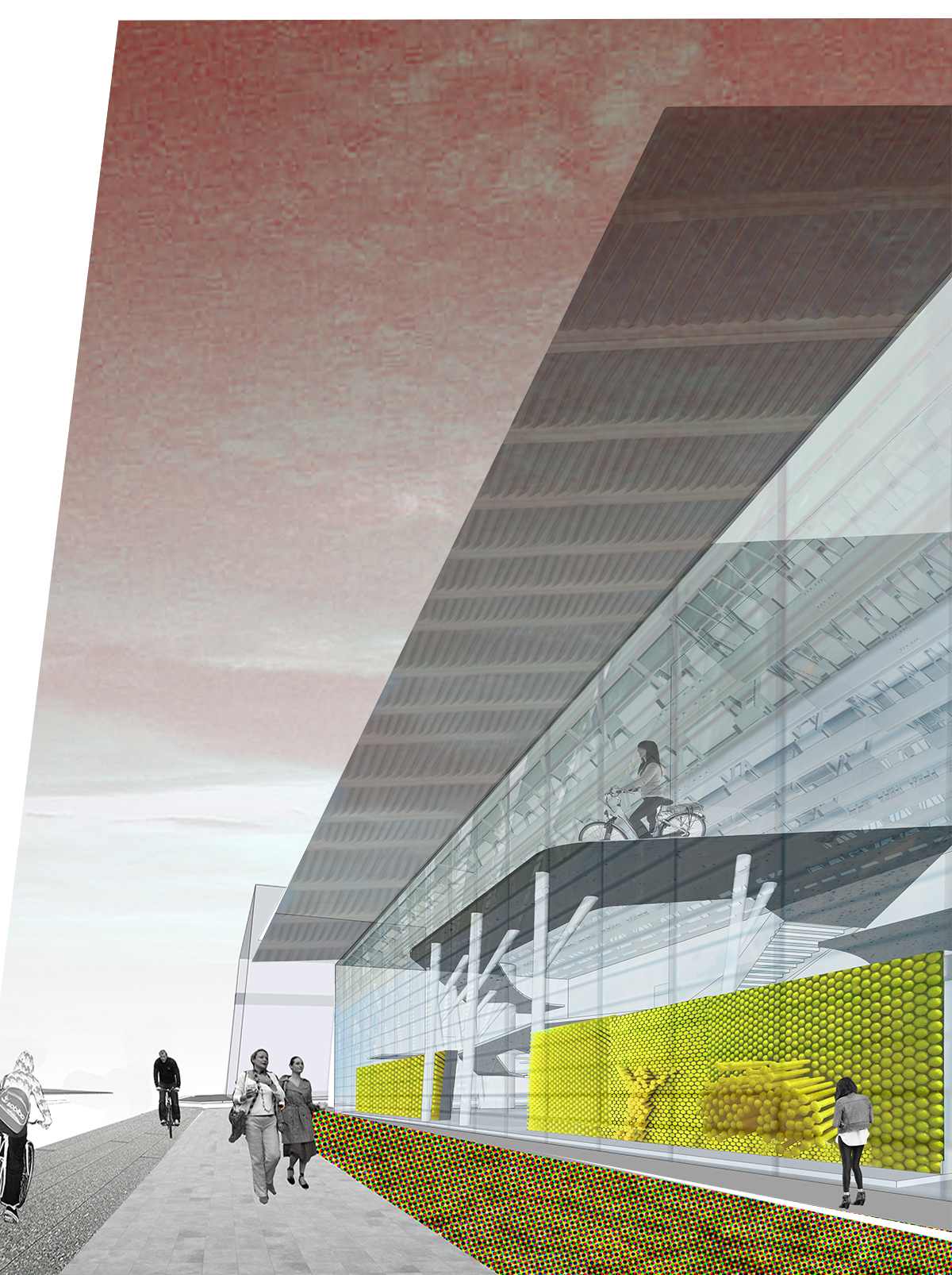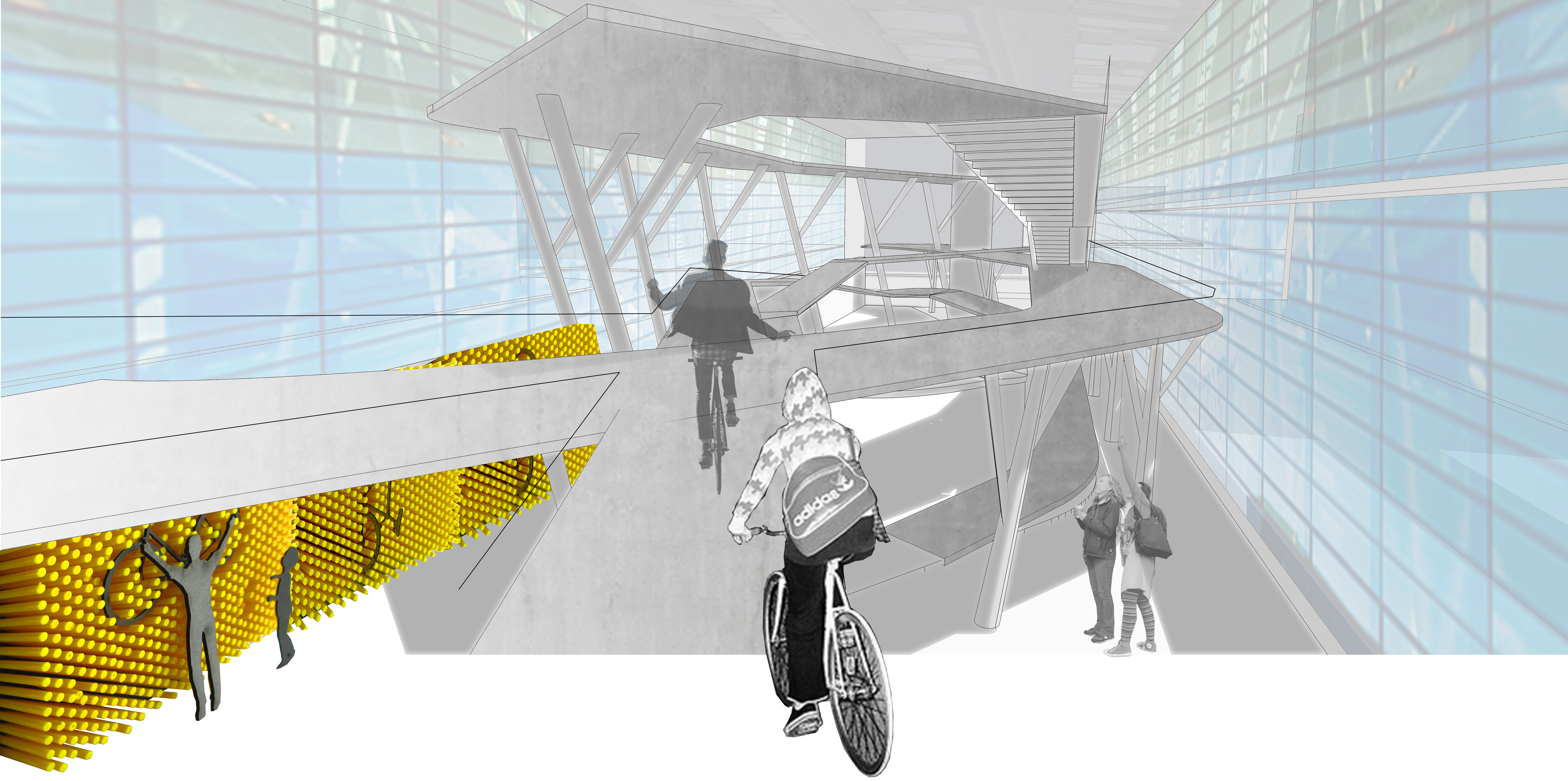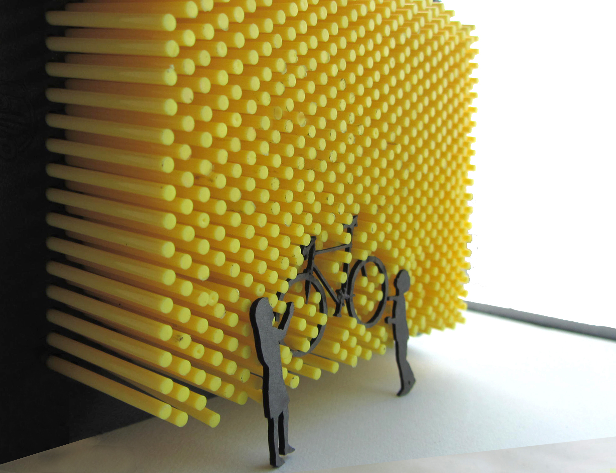 The playful pin art bike storage created for the facade of our envisioned Downtown Miami bike-centric transit station records the footprint of users and
