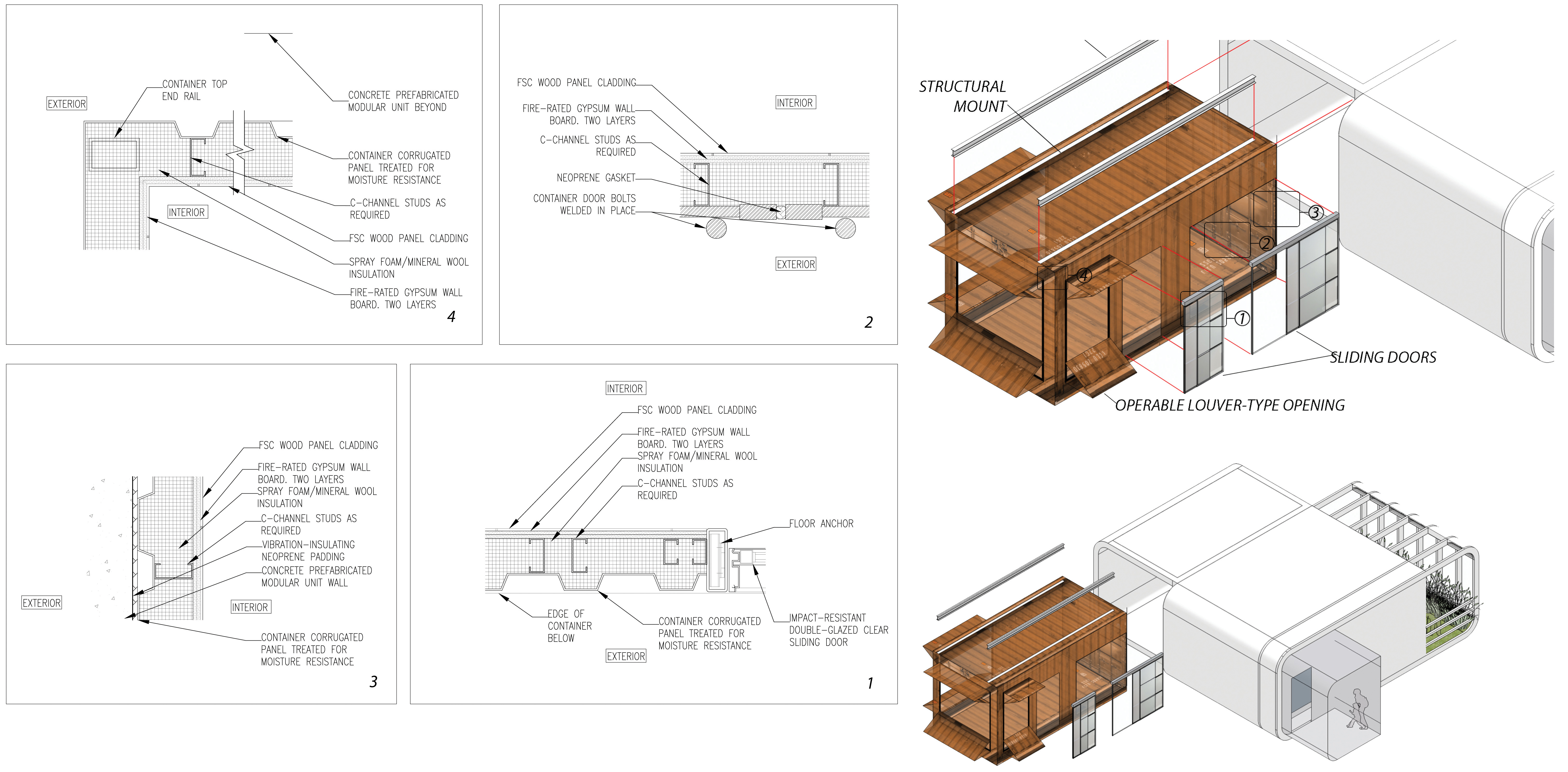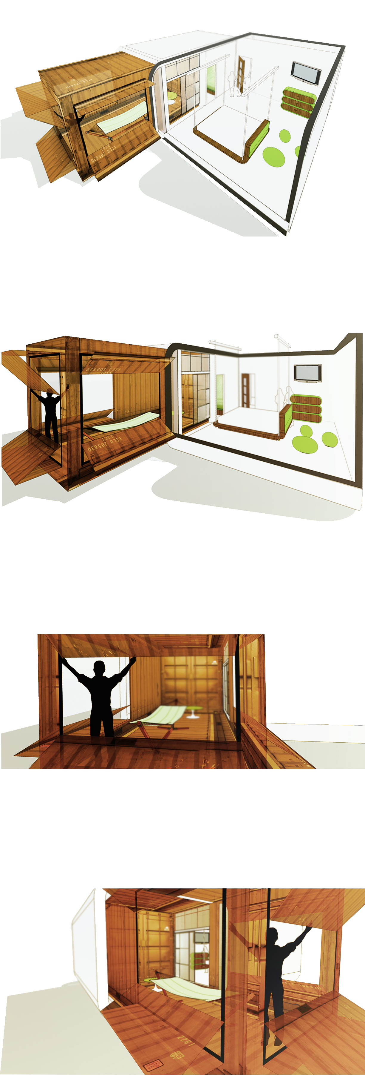 xtend+dwell allows residents in a given building arrangement to slide the extending balcony, -a rehabilitated shipping container housing a naturally ventilated lounging private space- in or out, (and to either side in the case of premium units) expanding or reducing space and views, and creating a dynamic building volume. The operable unit is nestled on a reinforced concrete shell.