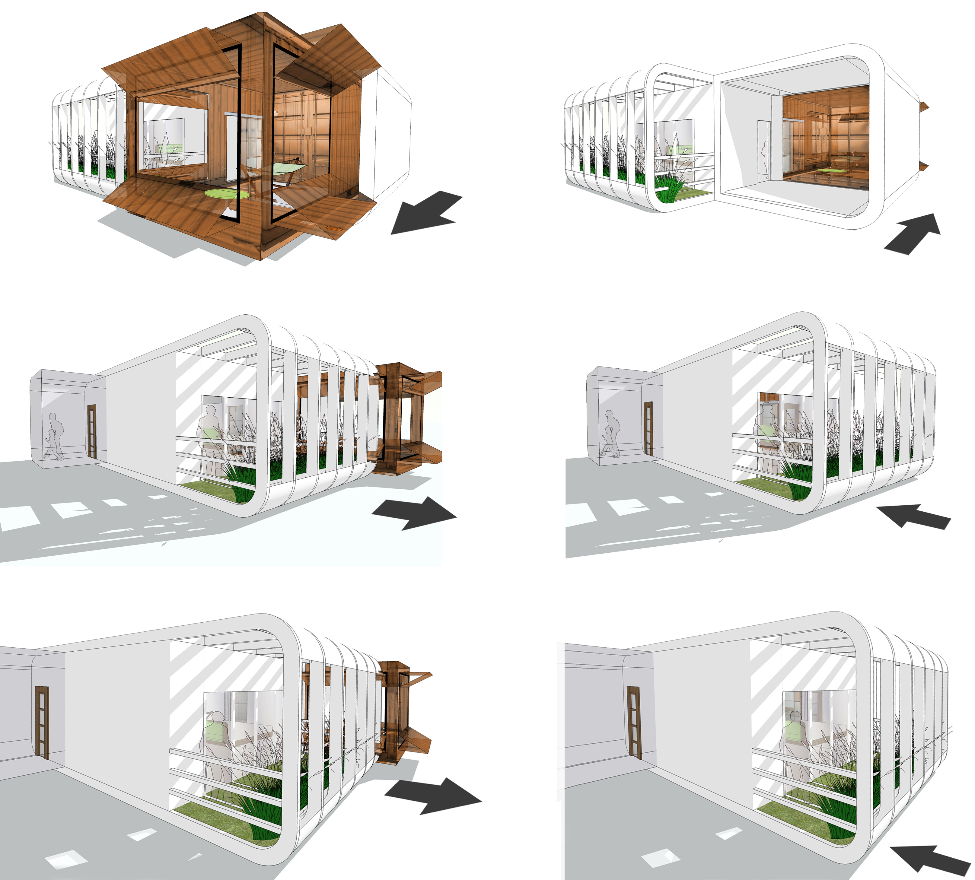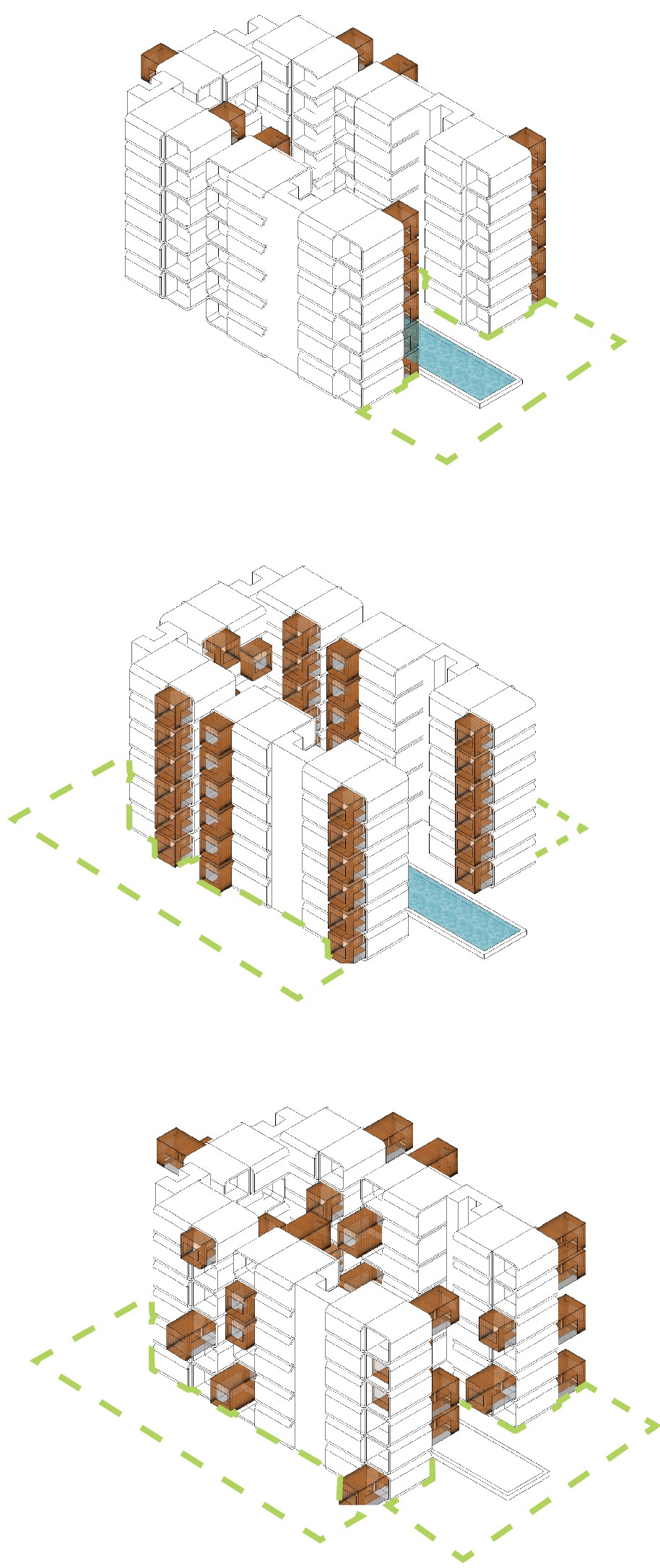 xtend+dwell Residences / Hotel is an idea for a habitational unit giving dwellers the ability to make a tangible imprint on the building’s facade at any given time by articulating their own spaces from private to semi private, to communal.